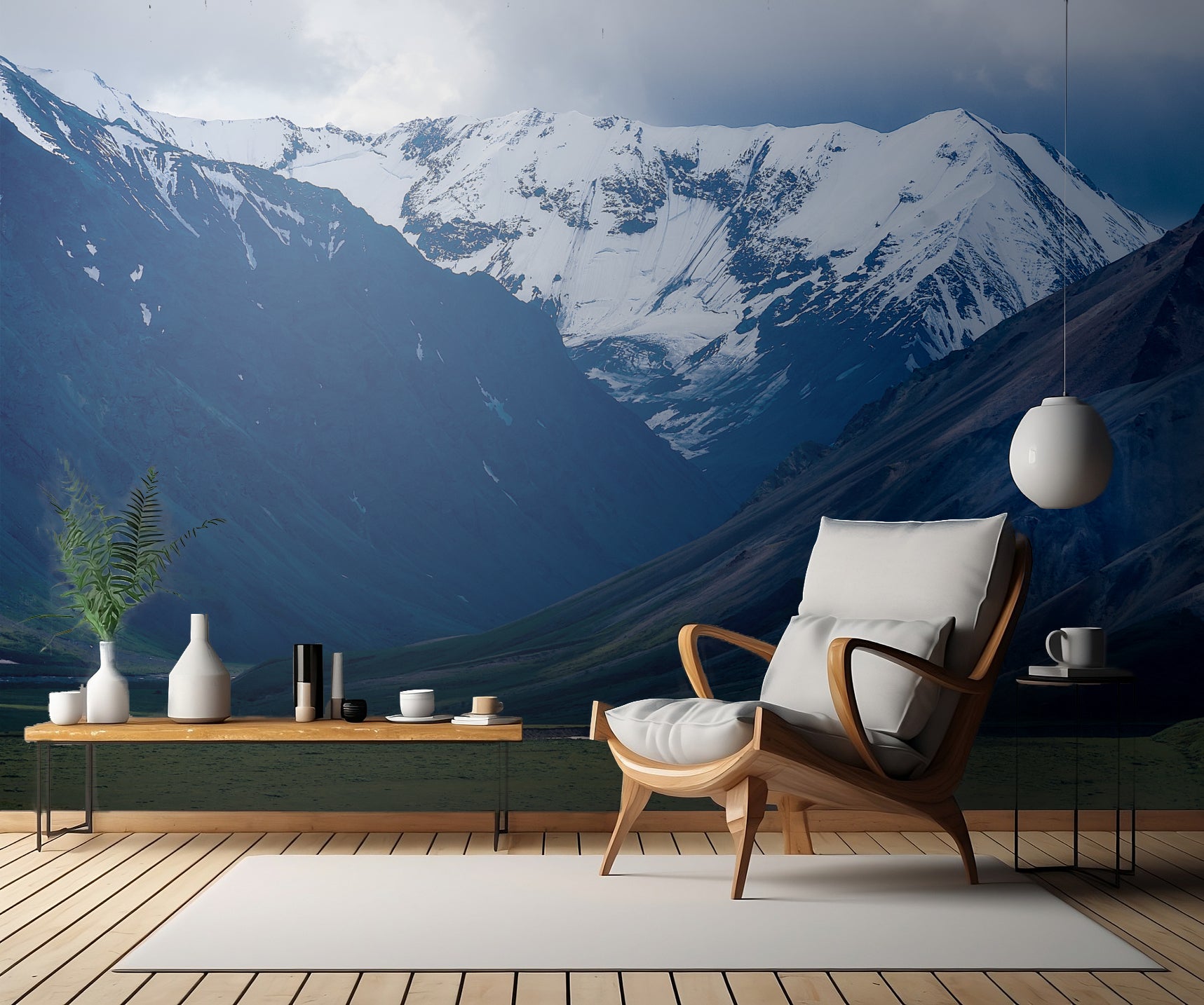 Föreställ dig att du står vid foten av en majestätisk bergskedja, omgiven av snötäckta toppar och en vacker dal. Denna unika väggtapet med namnet "山前" tar dig med på en äventyrlig resa genom en fantastisk landskap.