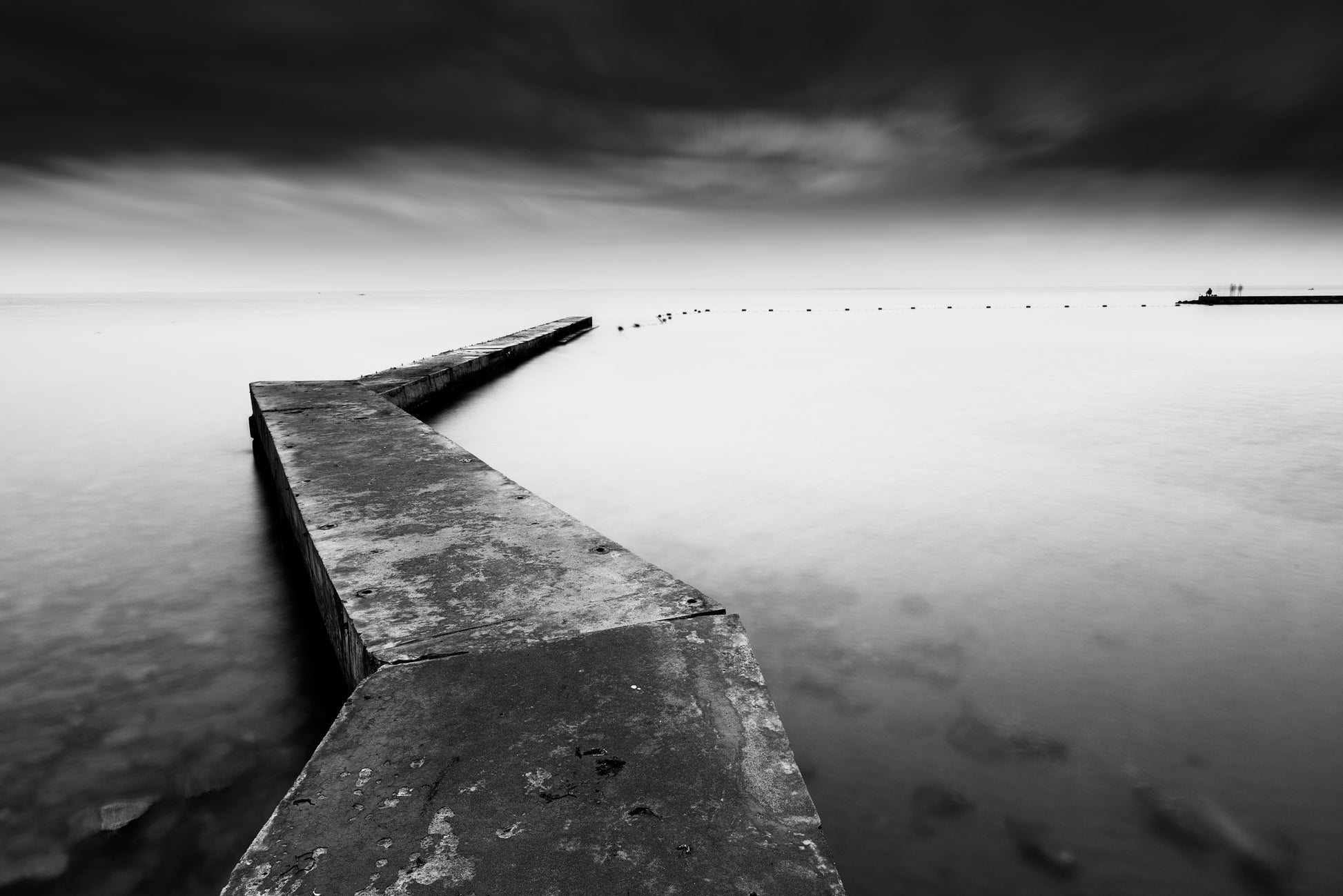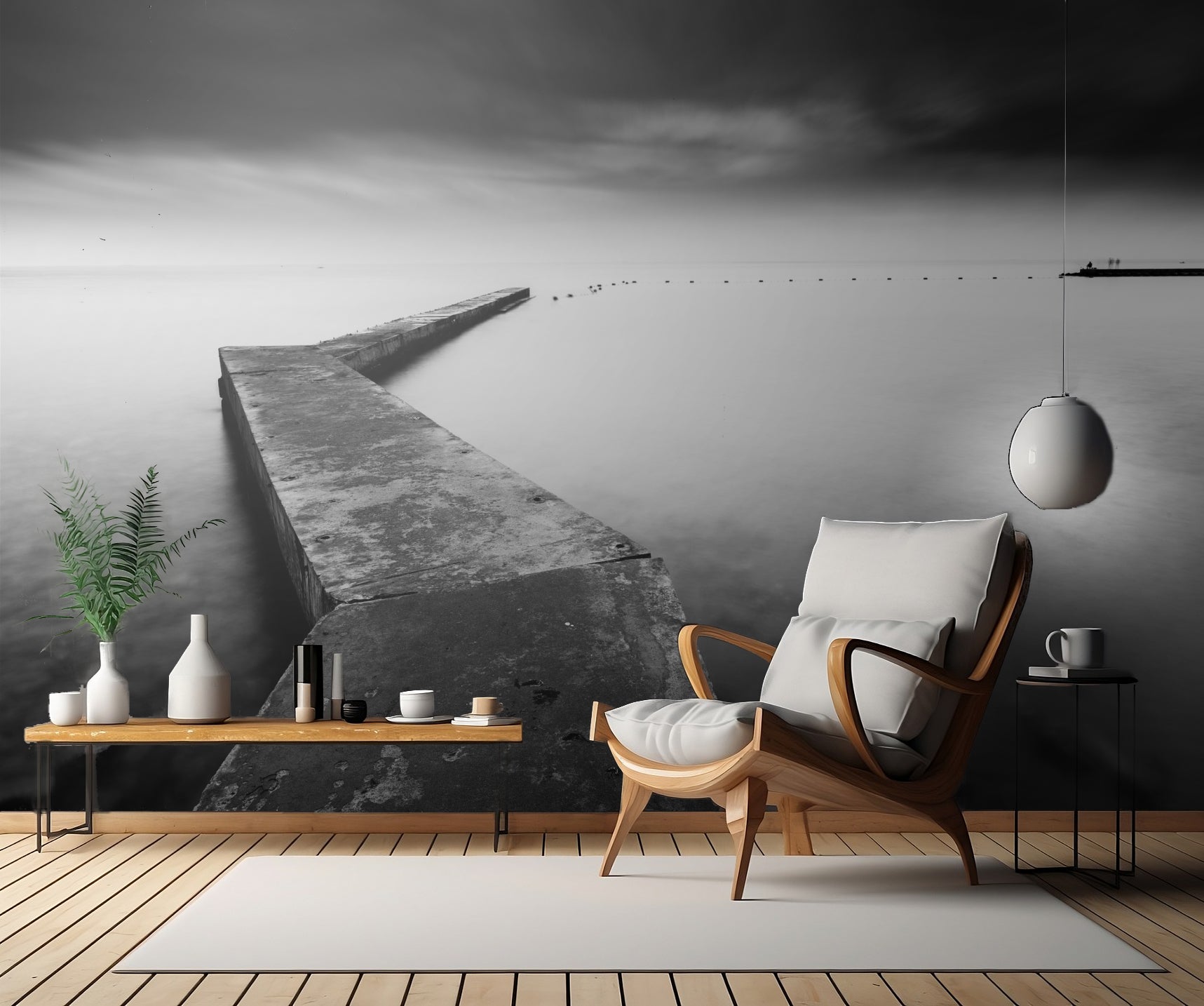 Denna unika tapet fångar uppmärksamheten med sin romantiska kustmiljö. Motivet visar en träbrygga som sträcker sig ut i havet, omgiven av lugna vågor och en underbar horisont. Den svartvita färgsättningen ger en touch av elegans och tidlöshet till rummet.