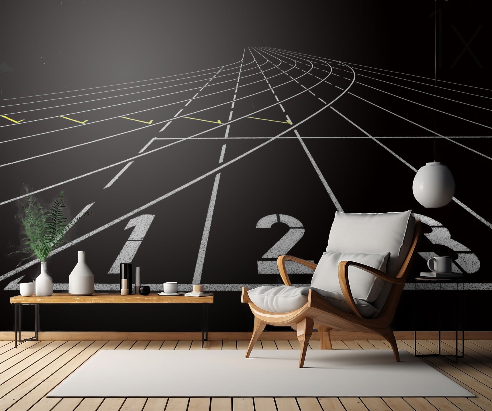 Med dess kontrasterande färger och grafiska design ger tapeten en modern touch till ditt rum. Den passar perfekt för den som älskar sport och vill ha en unik inredningsdetalj. Oavsett om du är en löpare själv eller bara uppskattar en sportig atmosfär, kommer tapeten "123" definitivt att bli ett samtalsämne bland dina gäster.