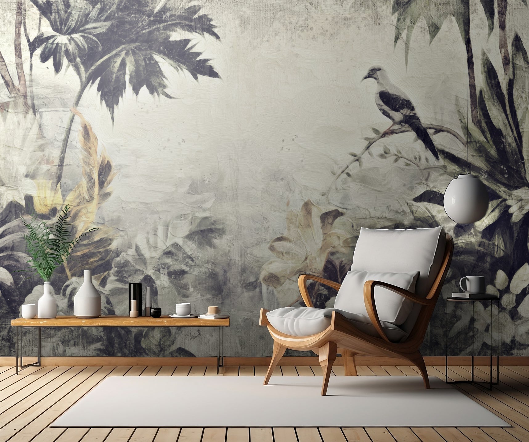 Med en mix av fåglar, djungelträd och landskapsskildringar ger denna tapet en unik touch till ditt hem. Den digitala konsten skapar en målerisk känsla som tar dig till en abstrakt och tropisk värld.