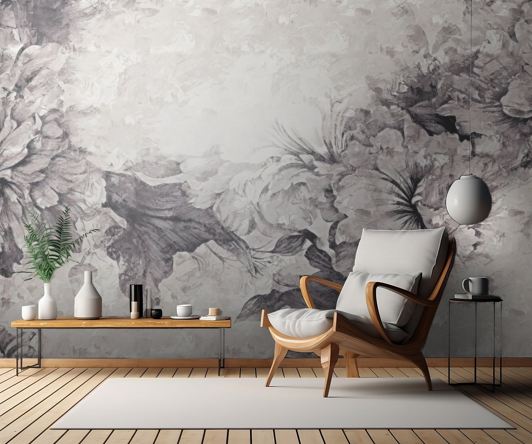 Med sina ljusa grå och härliga blommor ger denna tapet en känsla av fräschhet och elegans till ditt rum. Varje penseldrag och blomblad är tydligt synligt, vilket ger en intressant botanisk känsla till din vägg.