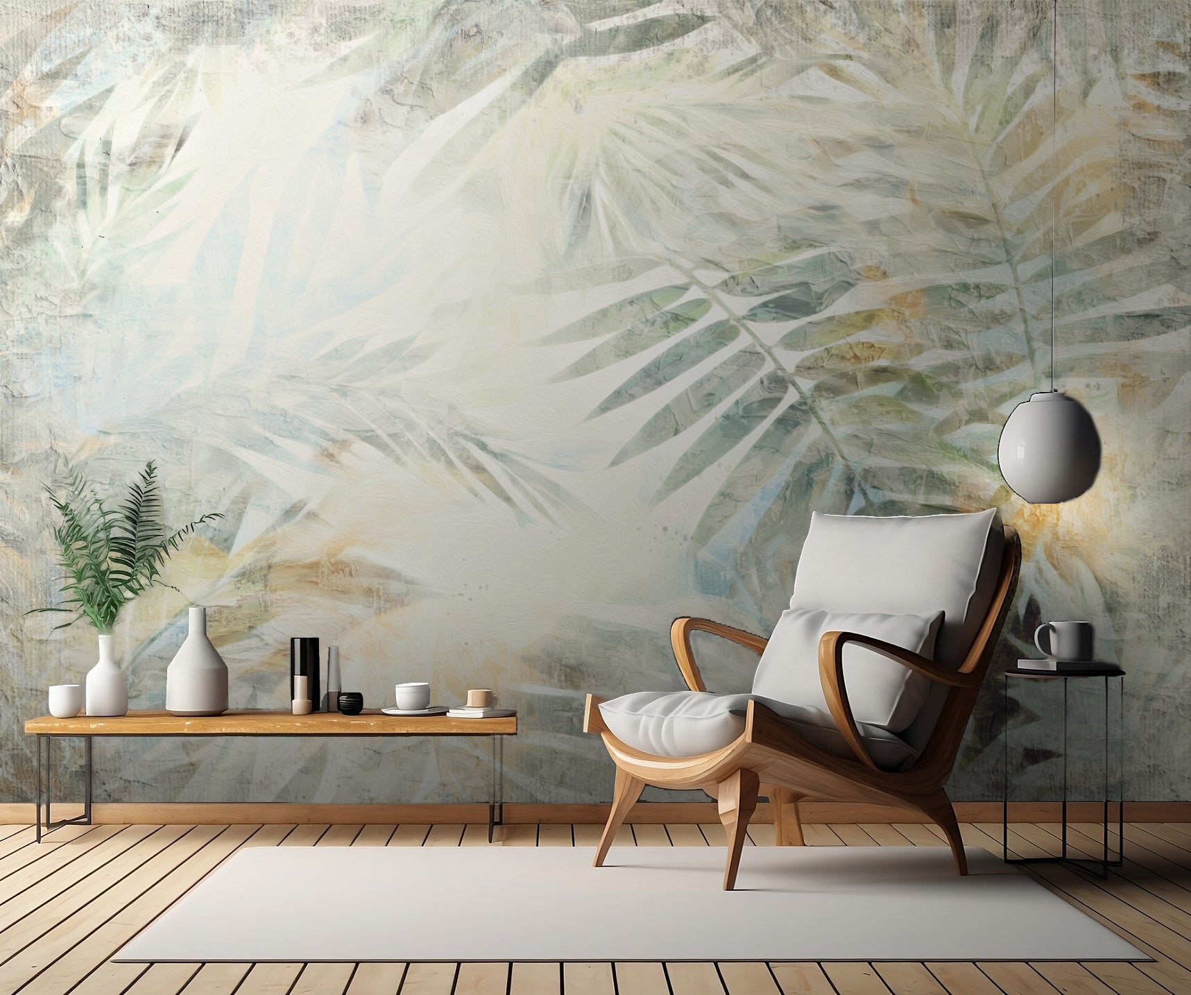 Den abstrakta designen med sina subtila texturer och palmmönster skapar en lugn och avslappnande atmosfär. Låt dig inspireras av den konstnärliga känslan och ge ditt rum en fräsch och modern touch med denna tapet.