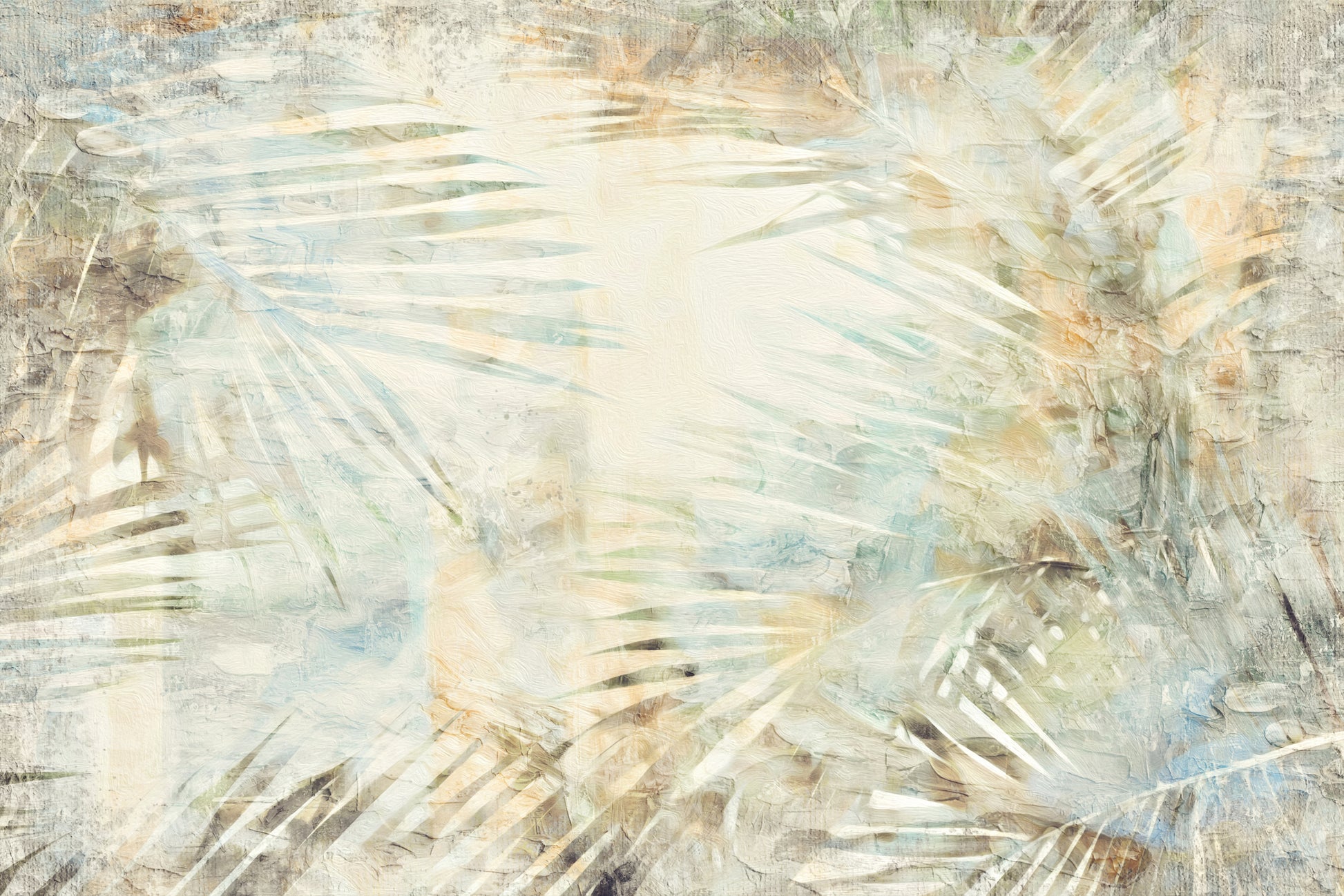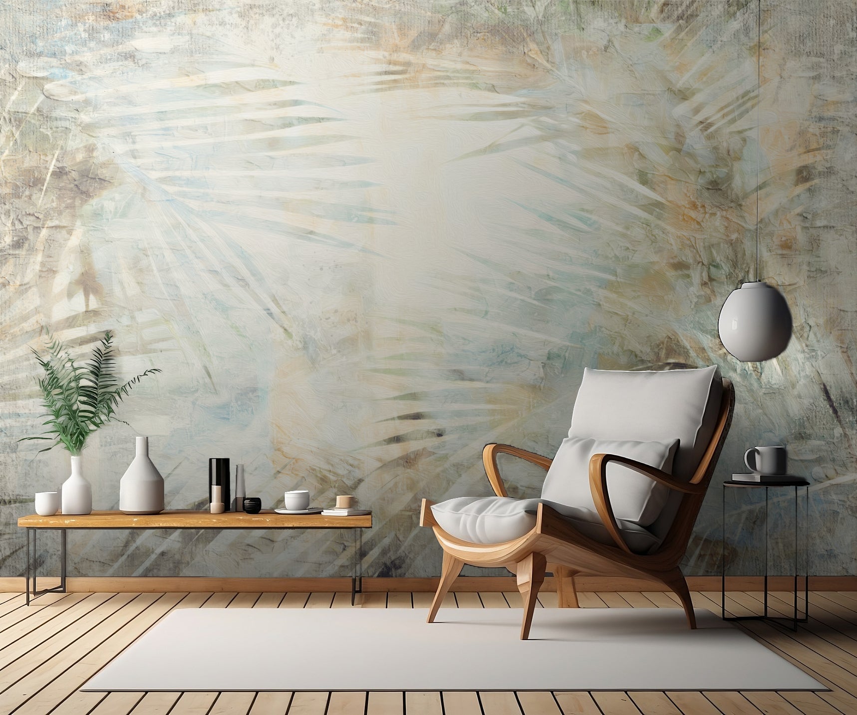 Mönstret är inspirerat av växtlighet, med palmlöv och blommor som skapar en lugn och harmonisk atmosfär.