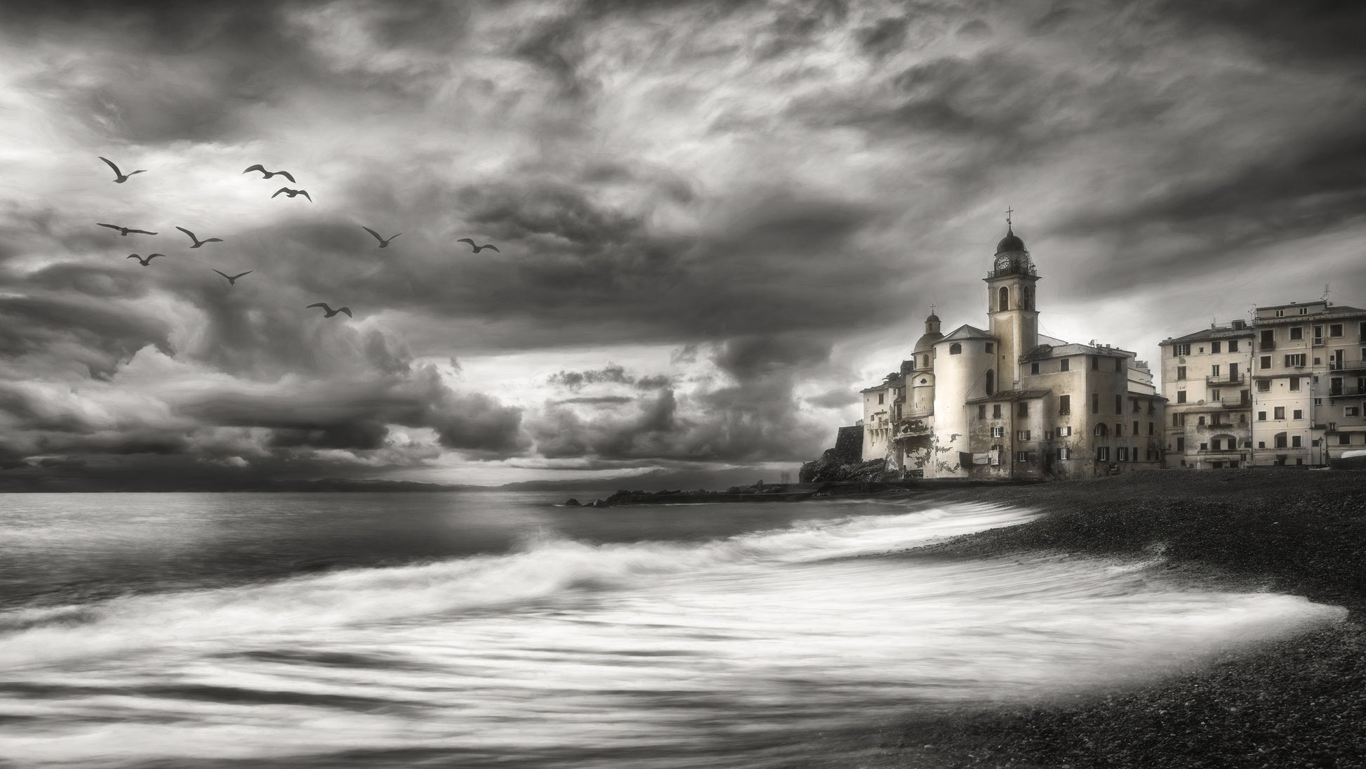 Ta med dig en bit av den italienska kusten in i ditt hem med väggtapeten "A day at the end of the day" skapad av Cristiano Giani. Denna vackra tapet fångar ett magiskt ögonblick vid solnedgången i Ligurien, med en fantastisk utsikt över det gamla staden och havet.