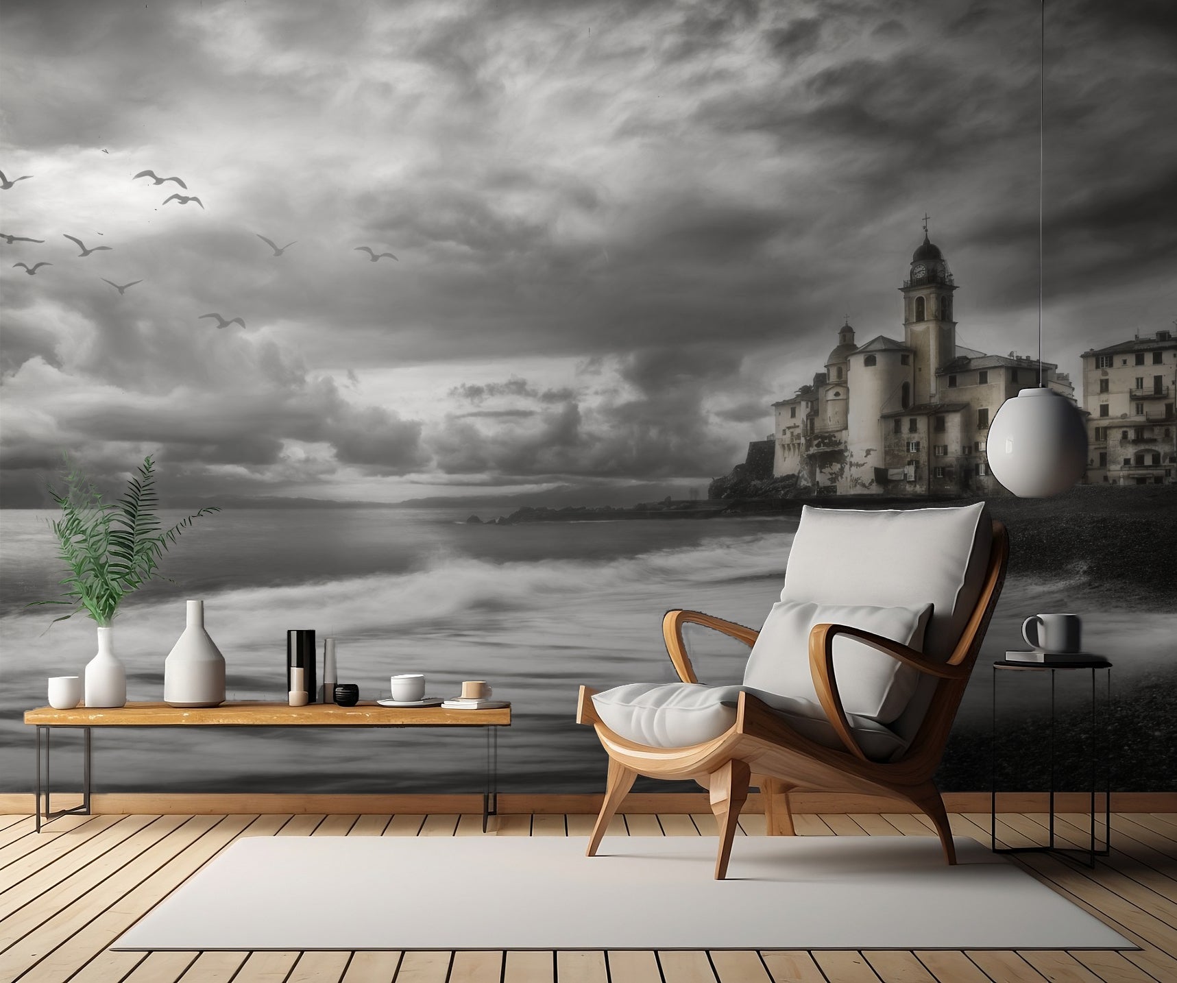 Landskapet och havet skapar en lugn och fridfull atmosfär i rummet, med moln som svävar över en dramatisk himmel. Fåglarna i fjärran ger en känsla av frihet och rörelse, medan det gamla tornet och kyrkan ger en känsla av historia och tradition.