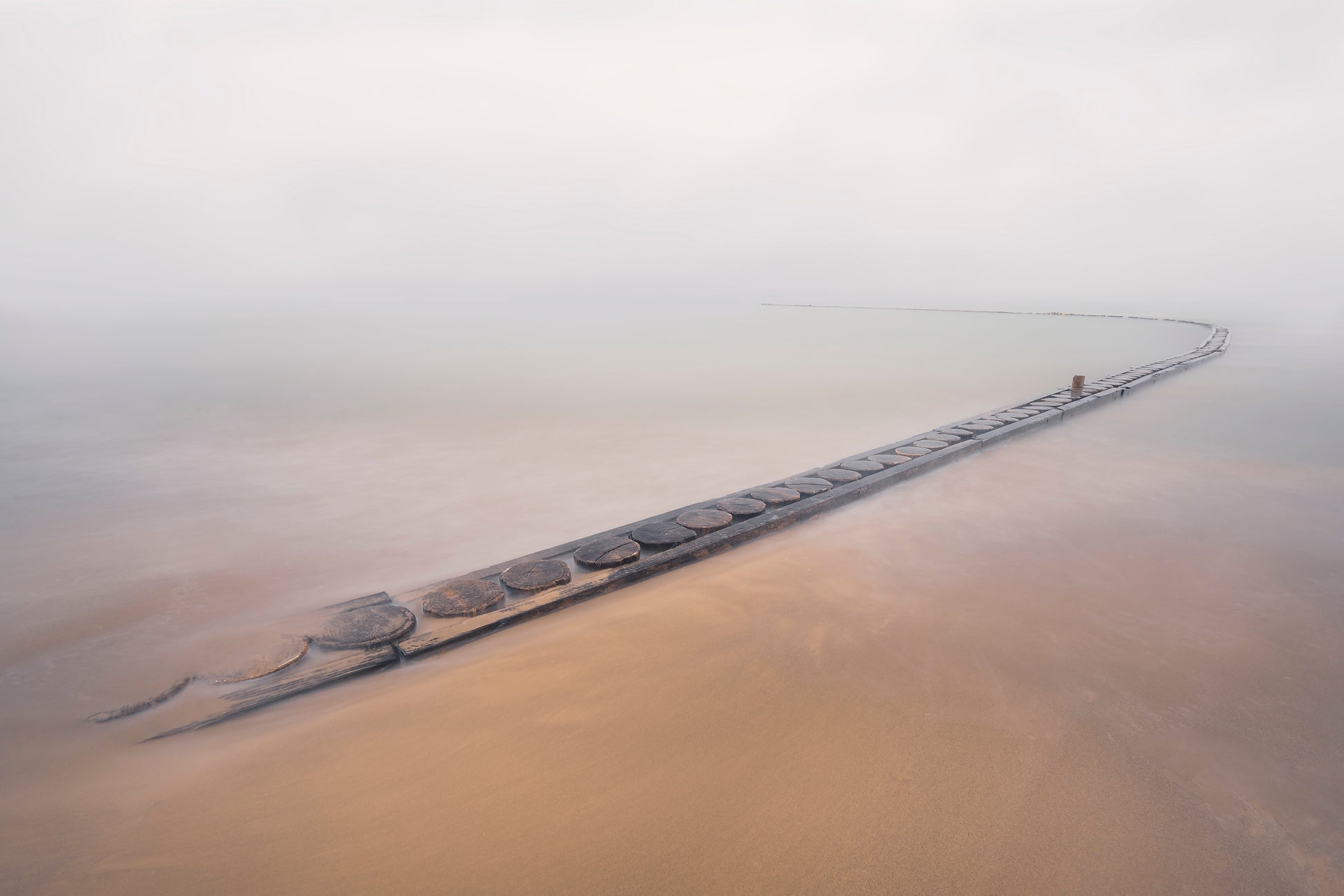 Med en lång exponeringsteknik har skaparen lyckats fånga en silkeslen och mjölkaktig effekt i bilden, vilket ger en illusion av rörelse och stillhet på samma gång. Dimma, dis och en kustlinje skapar en drömsk och lugn atmosfär som får dig att vilja stanna och försvinna in i bilden.