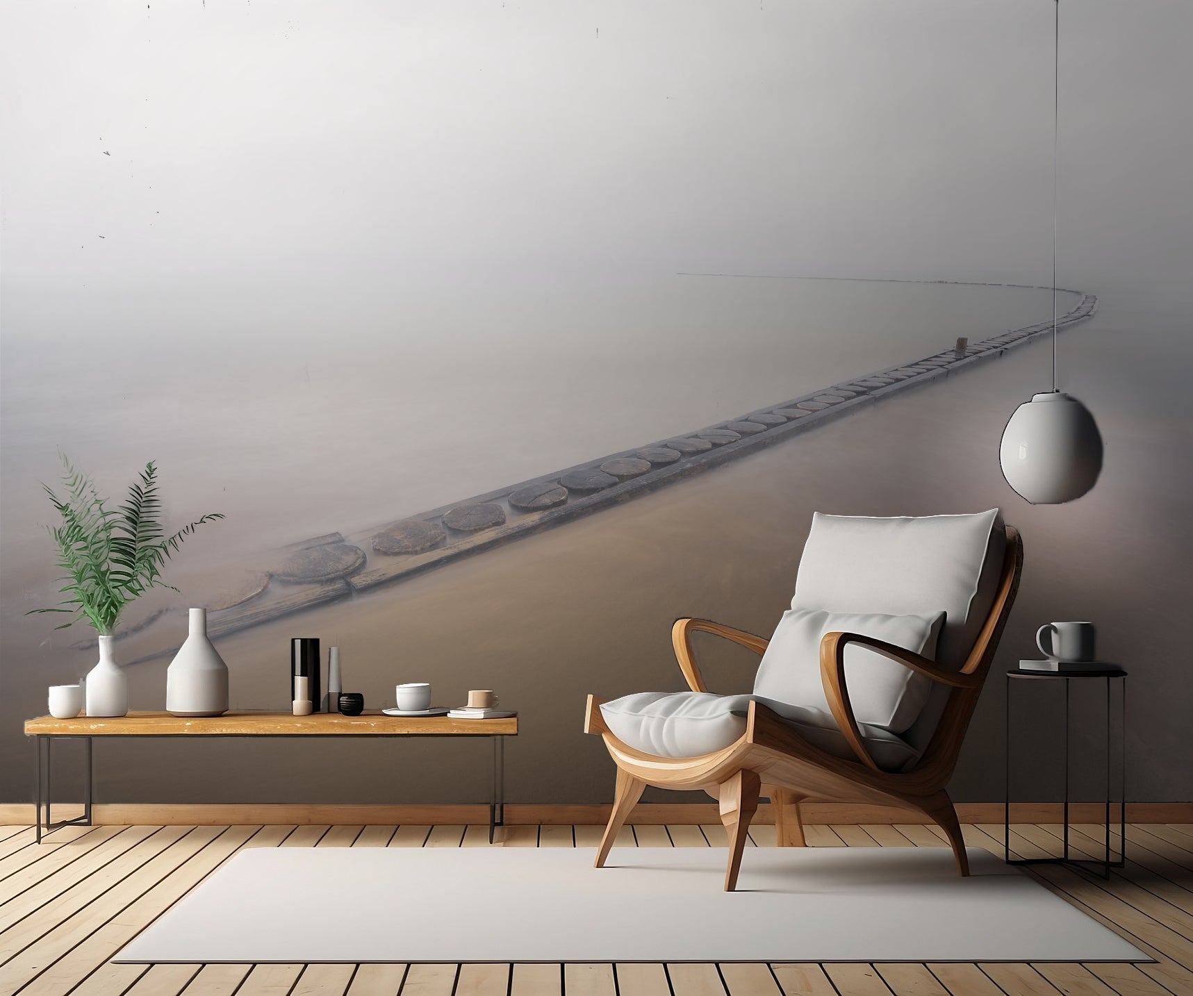 Ge ditt rum en lugn och harmonisk atmosfär med väggtapeten "A Fine Day to Exit" skapad av Thomas de Franzoni. Den här tapeten fångar en fantastisk kustlandskap med mjuka bruna och beiga toner som ger en känsla av lugn och ro.