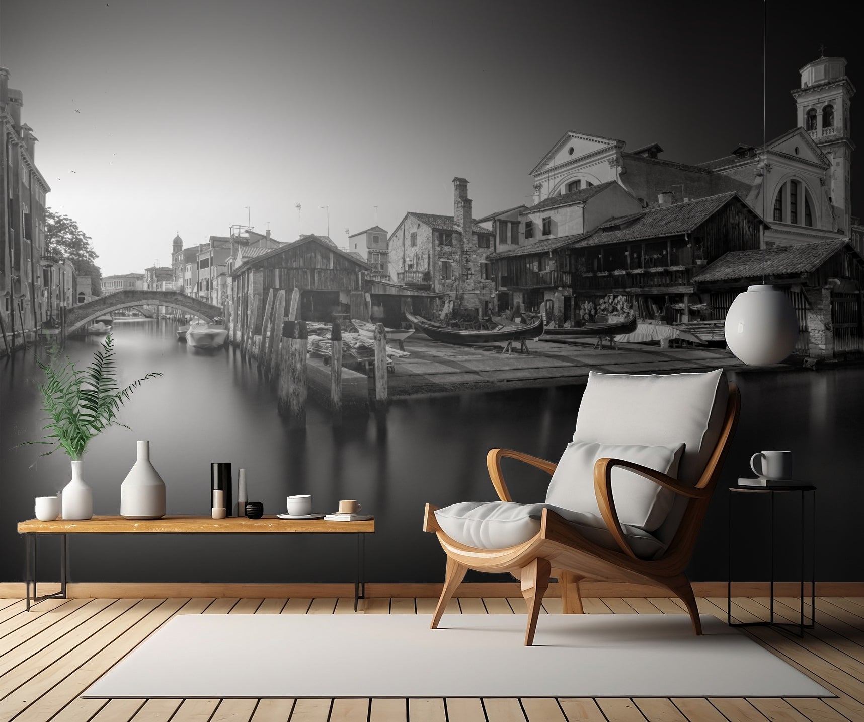 Vackert komponerad i svartvitt fångar denna tapet arkitekturens charm och traditionella karaktär i Venedig. Varje detalj från de gamla byggnaderna längs kanalerna, till de eleganta gondolerna och båtverkstäderna, finns med i denna konstnärliga komposition. Den perfekta kombinationen av gammalt och nytt, som tar dig med på en visuell resa genom Venedigs historia och kultur.