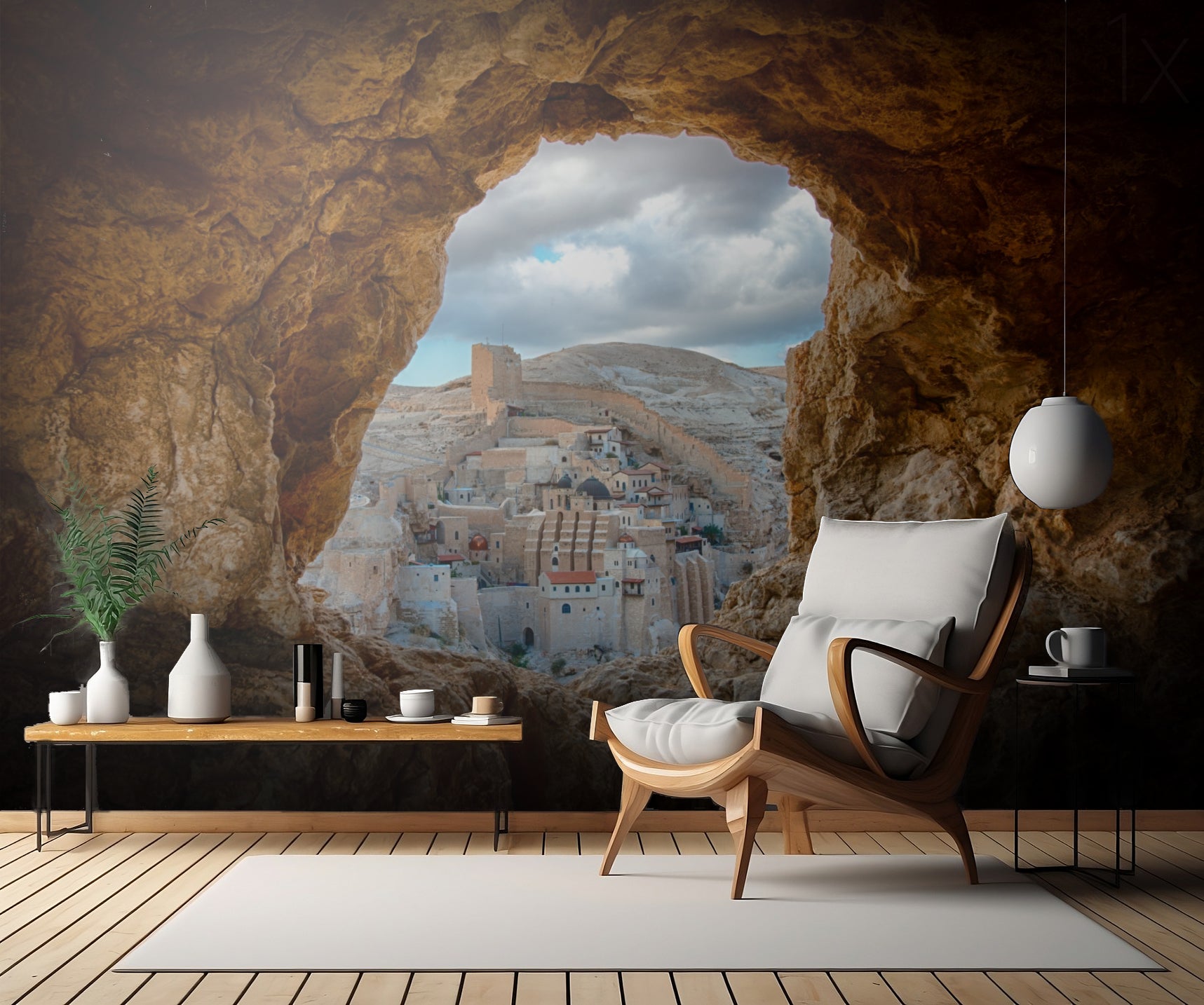 Med hjälp av detaljerade bilder av stenmurar, klippor och torn ger denna tapet dig känslan av att befinna dig mitt i en gammal by eller grotta. Utsikten över omgivningen och Kidron Valley är otrolig och ger en känsla av äventyr och upptäckt.