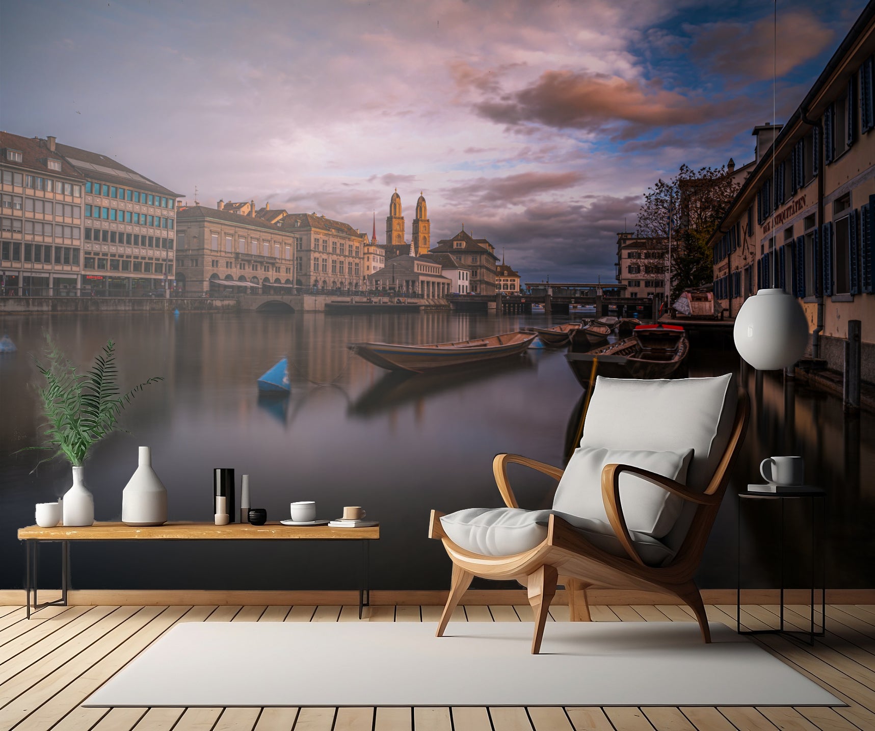 Förvandla ditt rum till en modern stadssilhuett med tapetens motiv av imponerande byggnader, pittoreska kanaler och båtar som glider fram på vattnet. Varje detalj, från de vackra kyrkorna och kapellerna till de spegelblanka floderna och strömmarna, förnyar ditt rum och ger en känsla av europeisk charm.