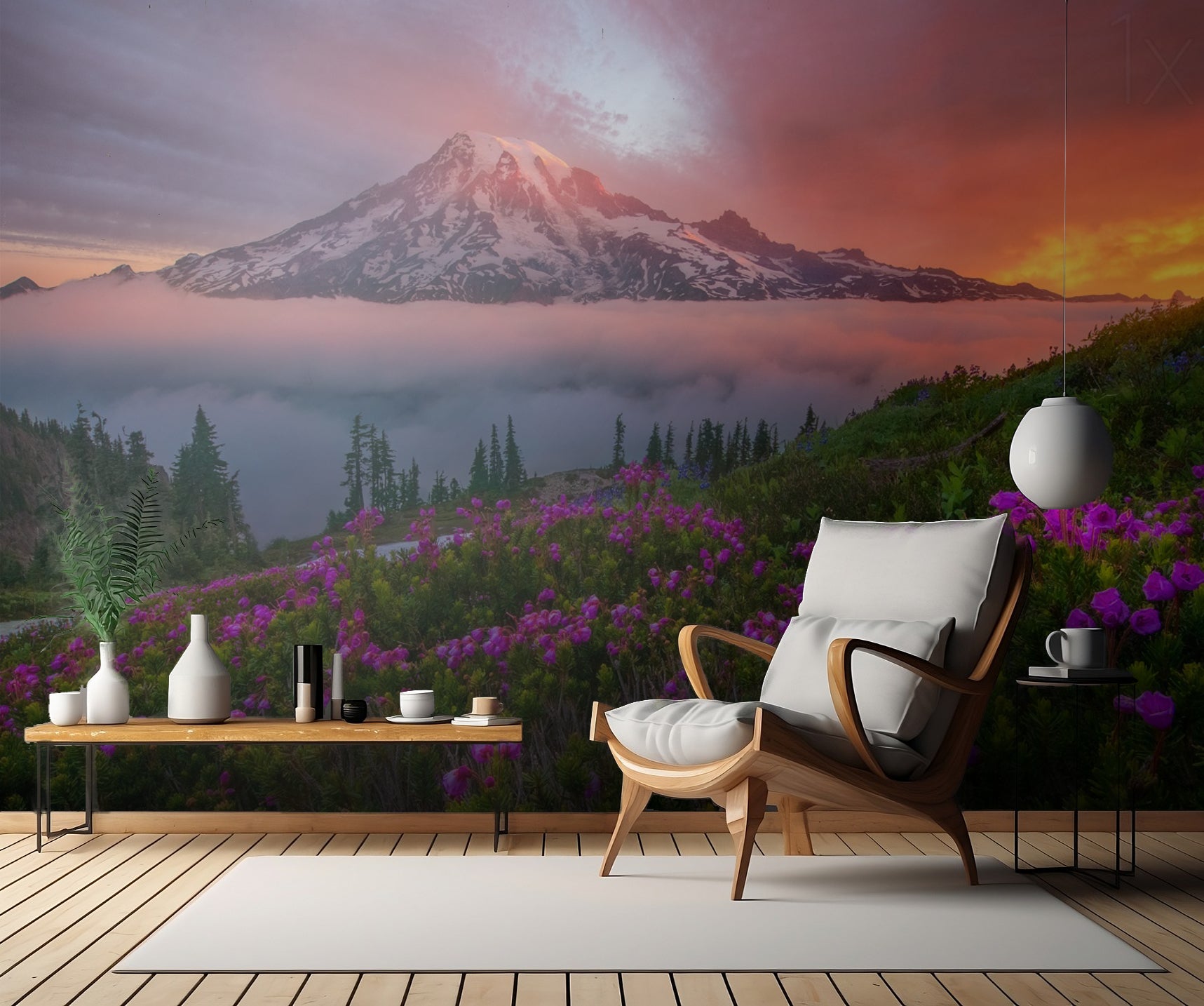 Tapetens raffinerade komposition gör att du kan ta in hela panoramat på ett harmoniskt och naturtroget sätt. Du drömmer dig bort till den mäktiga Mt Rainer och dess snöklädda toppar som reser sig stolt över en hav av moln. Ta in de slingrande alpina ridgerna som ger extra djup och dimension till tapeten.