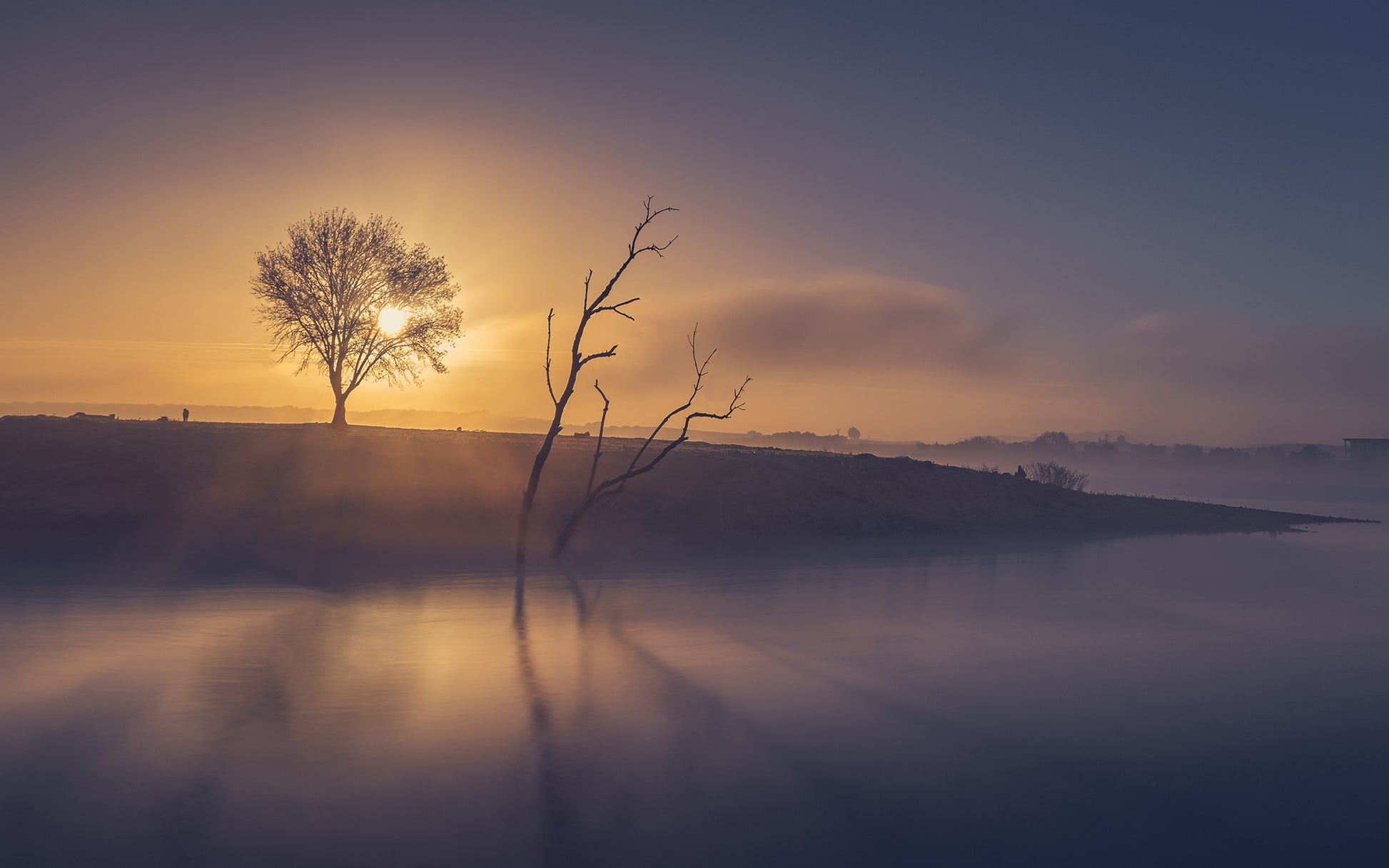 Denna landskapstapet lockar fram lugnet i ditt rum och skapar en fridfull atmosfär. Med sitt dimmiga morgondis, ger tapeten illusionen av ett tyst och stilla landskap. En enslig tyst trädstam skapar ett fokuspunkt, medan trädens konturer förlorar sig i dimman, vilket ger en känsla av mystik och äventyr.