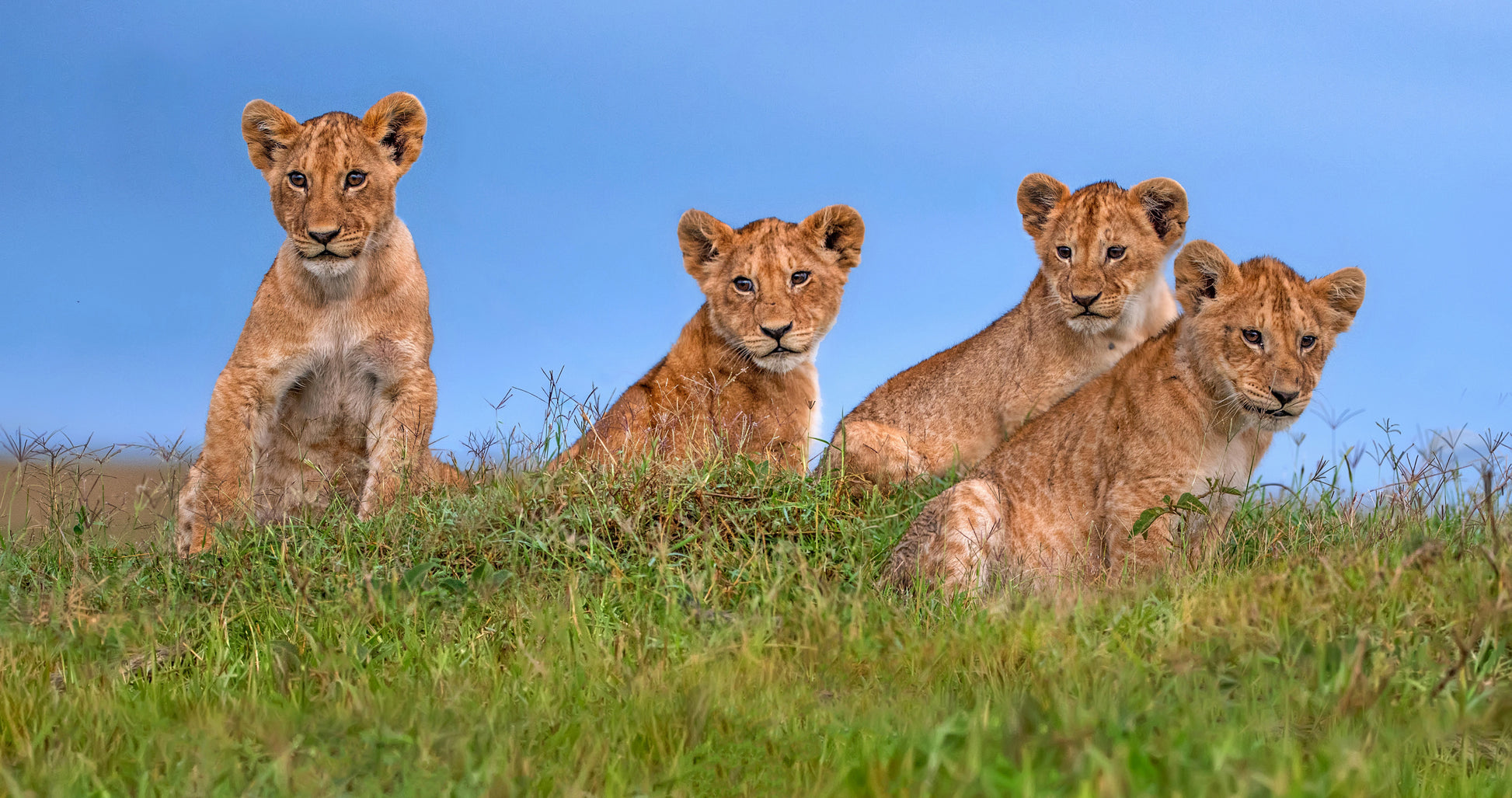 Möt lejonfamiljen som strövar genom det höga gräset i sina naturliga omgivningar. Två lejonungar leker och samsas om uppmärksamheten från sina stolta föräldrar. Deras lekfullhet och oskyldighet är svår att motstå och sprider en känsla av värme och ömhet.