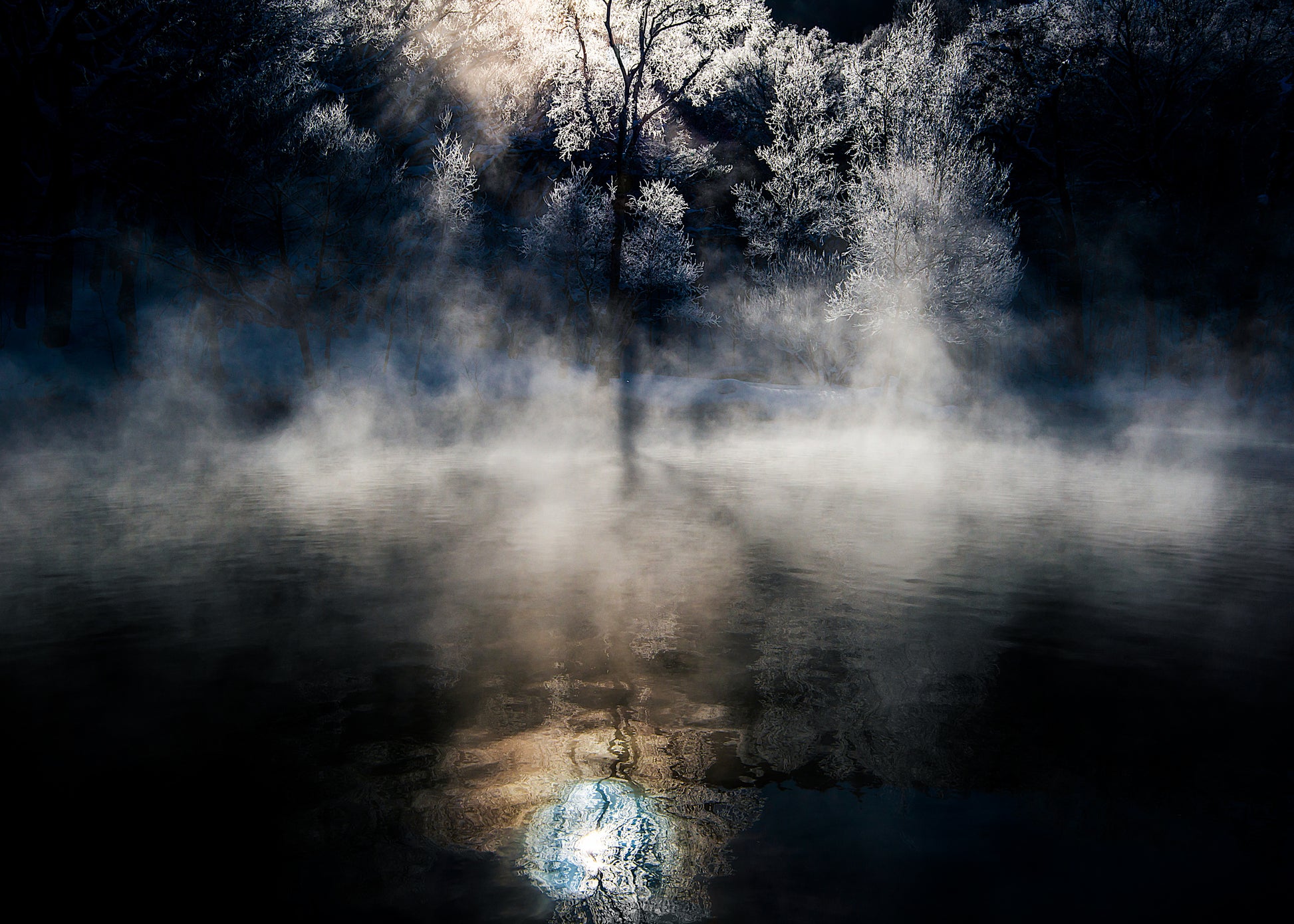 I denna design fångas solens strålar på ett förtrollande sätt, vilket ger en känsla av hopp och ljus mitt i den kalla vintern. Med snöklädda träd, dimma och en frosen damm skapar tapeten en lugn och fridfull känsla i rummet.