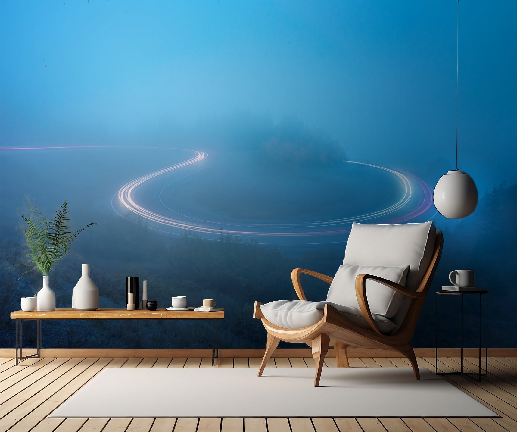 Med tapeten skapar du även en känsla av djup och rörelse. Kurvorna i vägen leder dig på en resa genom landskapet och Ratio_14 ger tapeten en speciell och harmonisk balans.