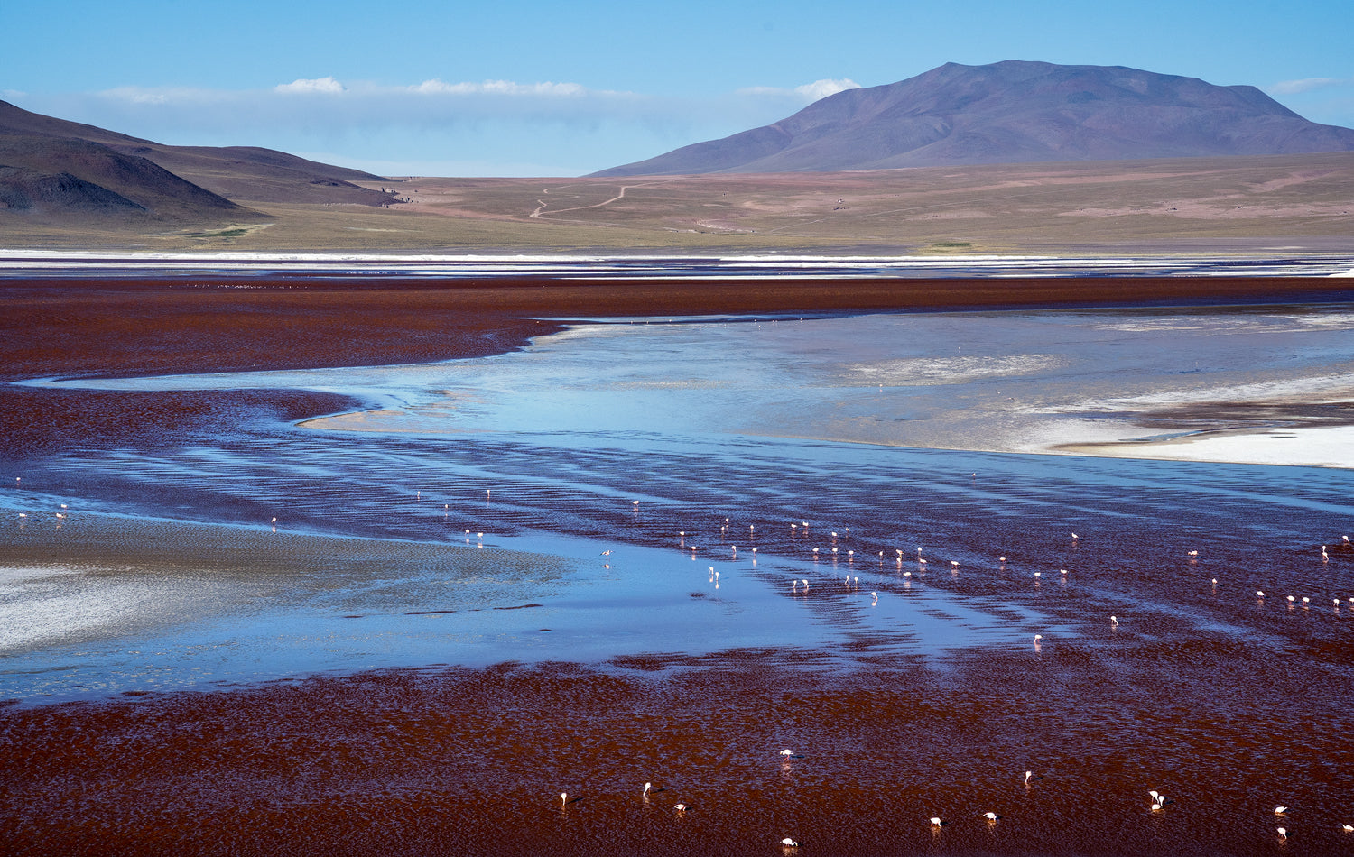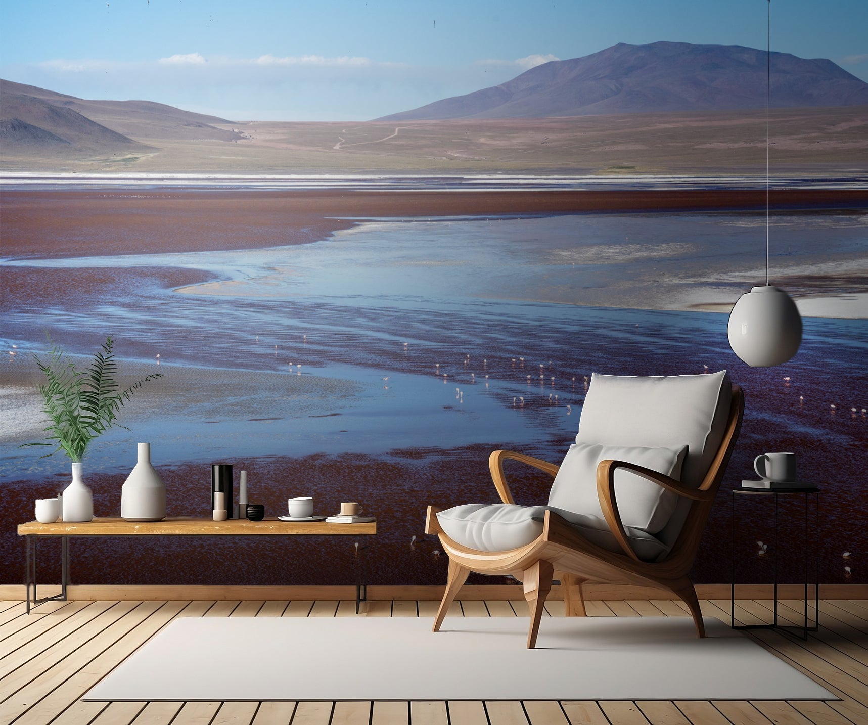 Den djupa blå färgen ger rummet en känsla av vidsträckt vatten, medan de bruna och gröna tonerna ger ett naturligt och lugnt intryck. Motivet med flamingos vid en sjö i Bolivia eller Chile skapar en härlig atmosfär av frihet och natur. Tapeten passar perfekt i ett vardagsrum, sovrum eller kontor där man vill skapa en avslappnad och inspirerande miljö.