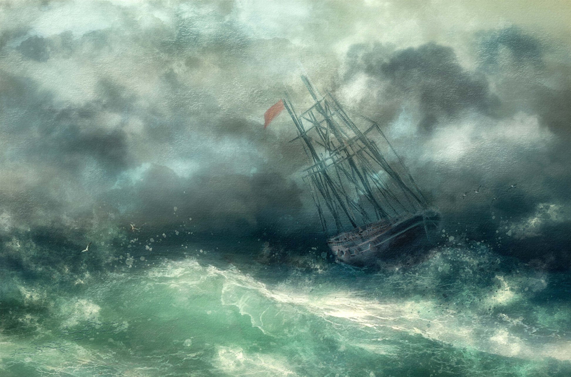 Med sin harmoni av färger och konstnärliga filter skapar '...a struggle in stormy seas...' en unik och livlig landskapsbild som för tankarna till segling och äventyr till sjöss. Låt denna tapet bli prydnaden på din vägg och låt den låta dig drömma dig bort till de vidsträckta haven.