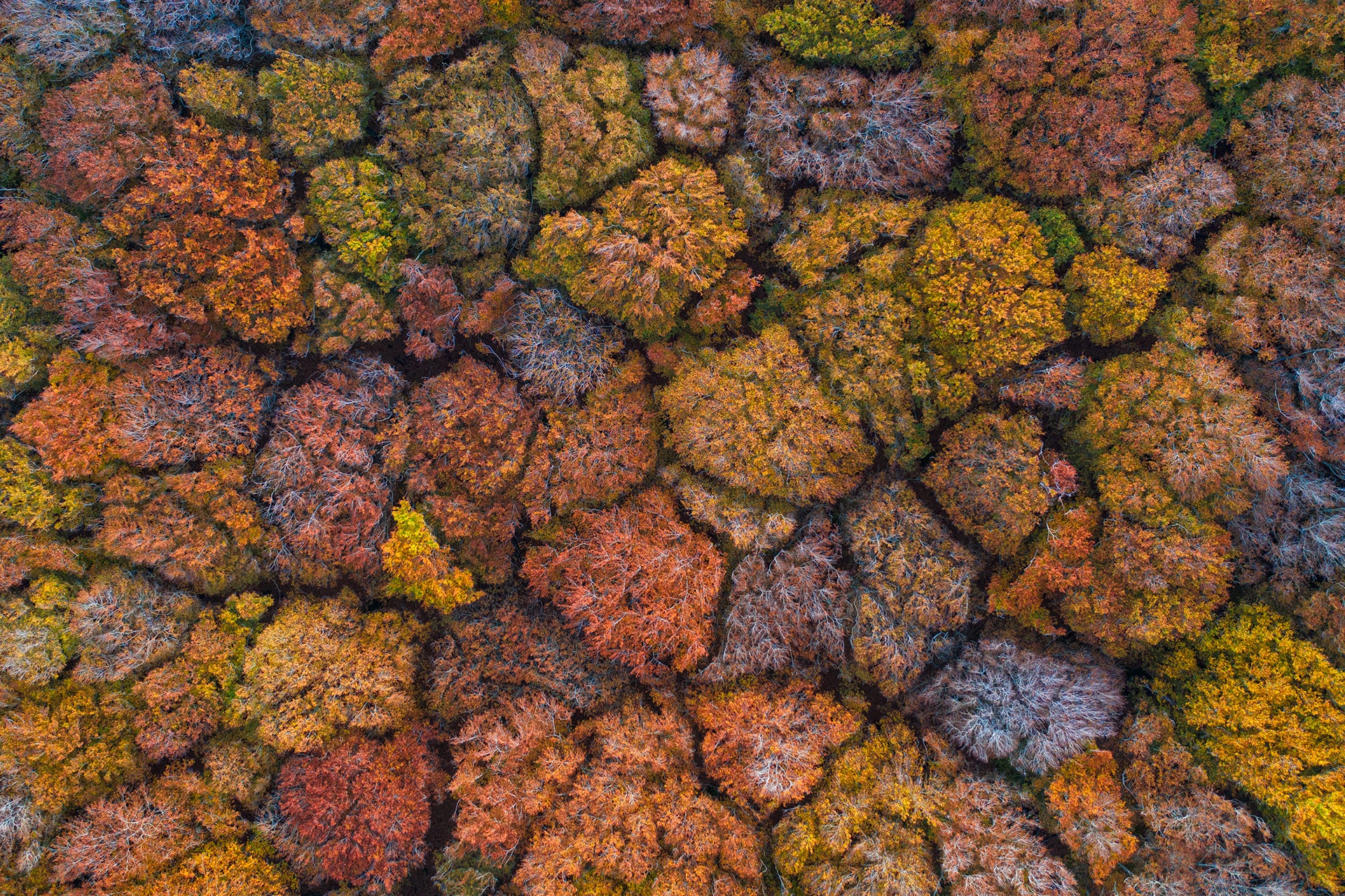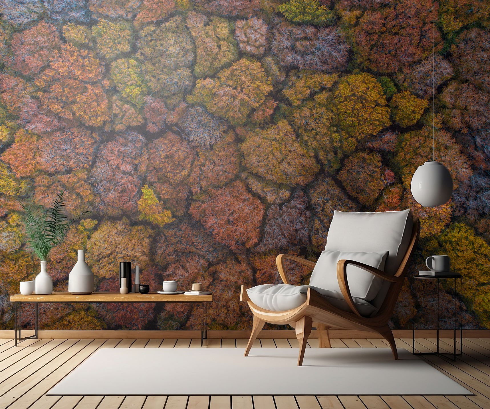 Med denna tapet får du känslan av att sväva ovanför ett färgsprakande hav av bokträd och se det fantastiska färgspelet som löven skapar. Den abstrakta touchen och drönarperspektivet ger en ovanlig och intressant twist till landskapsmotivet.
