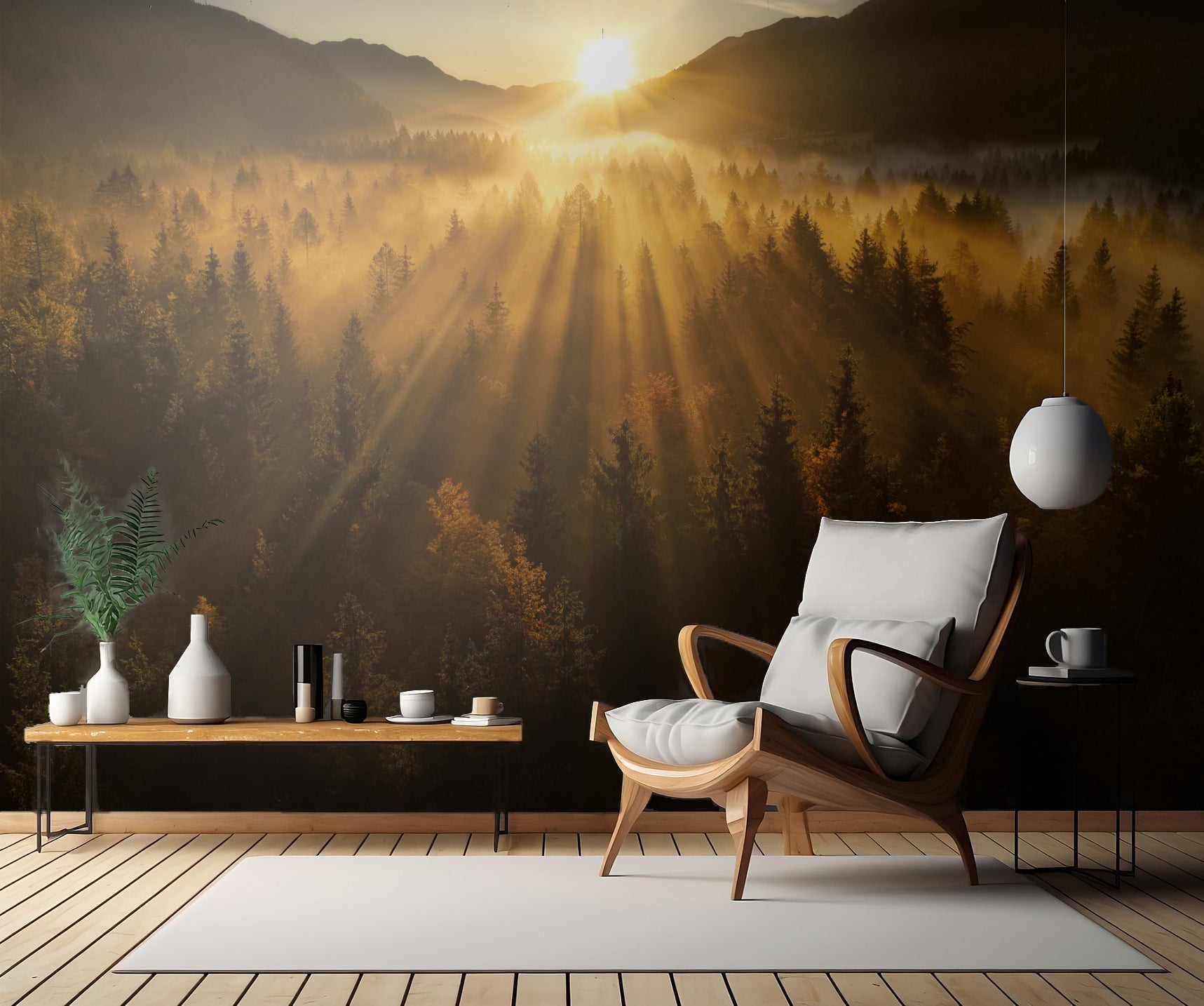 Njut av den gyllene skönheten i skogen när solens strålar smyger sig genom träden och skapar en härlig känsla av morgondimma och guldiga toner. Upplev lugnet som sprider sig när du tittar på de dimhöljda bergen i bakgrunden och känslan av att vara omgiven av naturens underverk.