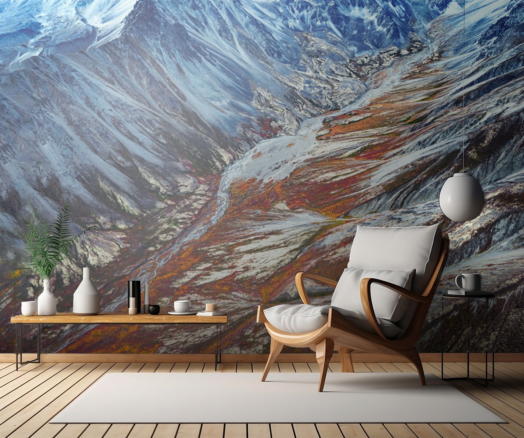 Förvandla ditt rum till ett majestätiskt landskap med väggtapeten "Alaska Pained Valley". Med denna tapet kan du skapa en slående och harmonisk atmosfär som tar dig till de vackraste delarna av Alaskas landskap.