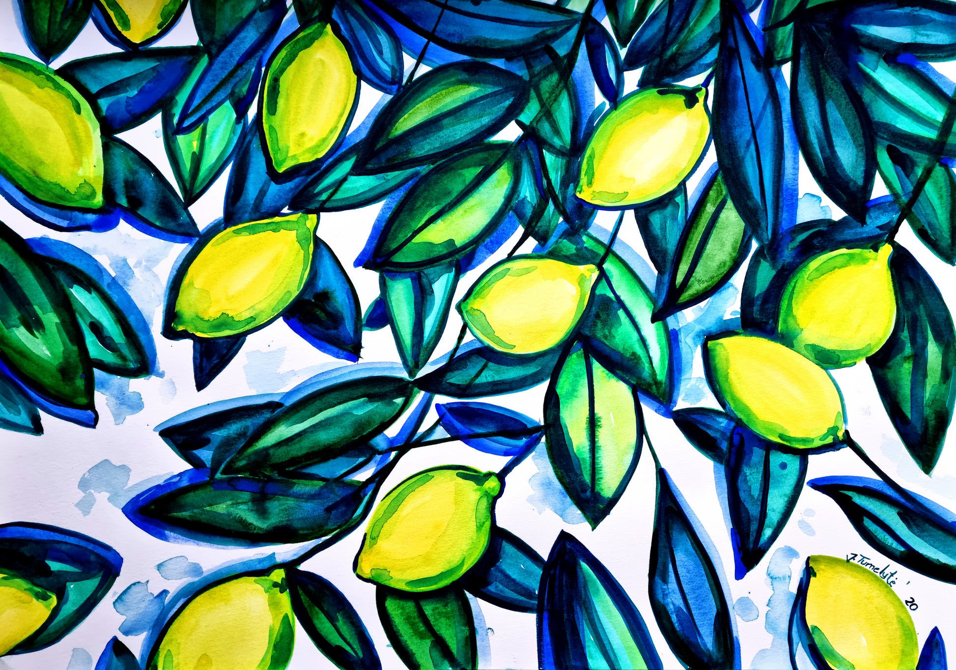 Med illustrationer av citronträdets gröna lövverk, grenar och de gula frukterna skapade av konstnären Julija Belickienė, ger denna tapet ditt rum en uppfriskande känsla av sommar. De lätta blå tonerna i bakgrunden skapar en lugn och fridfull atmosfär, perfekt för att skapa en frisk och fräsch inredning.