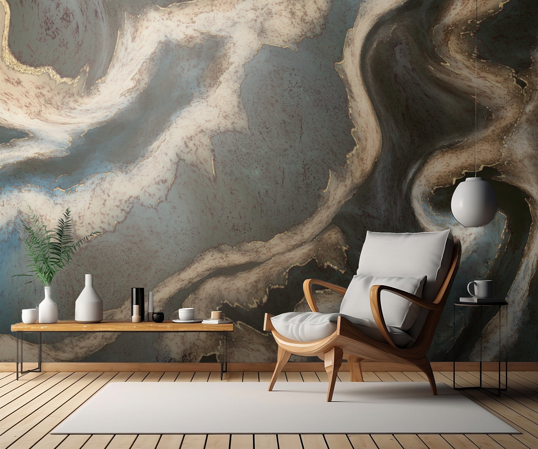 Med en närbild av alkoholbläckets virvlande mönster i guld och blått får tapeten en grafisk och detaljerad yta som ger rummet djup och dimension. Varje penseldrag och färgskiftning kan betraktas som ett konstverk i sig självt, vilket ger rummet en unik och personlig touch.