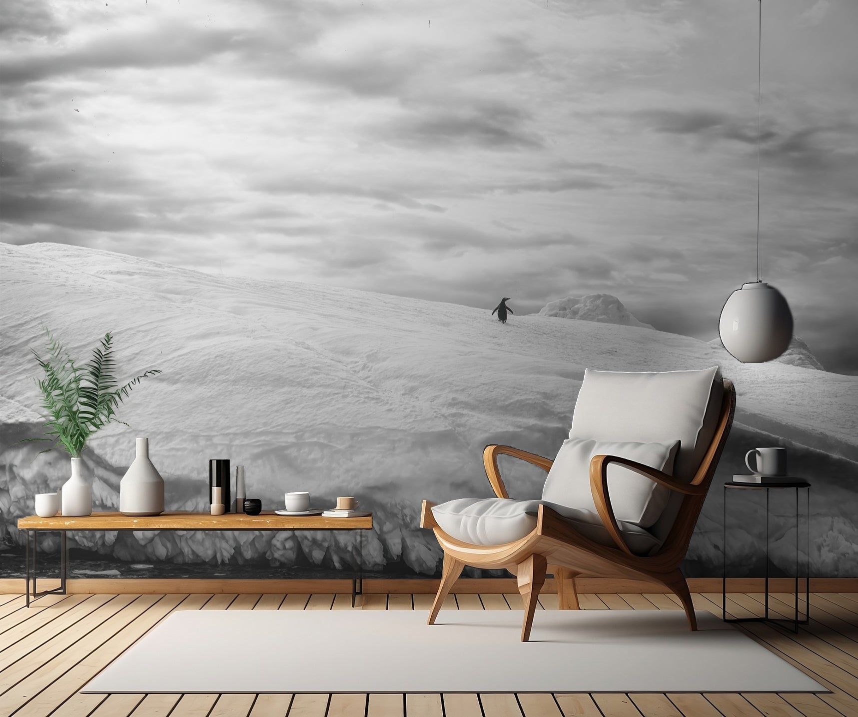De svartvita nyanserna för tankarna till isiga glaciärer, snöklädda berg och det kalla arktiska klimatet. Med motiv av pingviner som navigerar genom det frusna landskapet ger tapeten en känsla av lugn och stillhet till ditt rum.