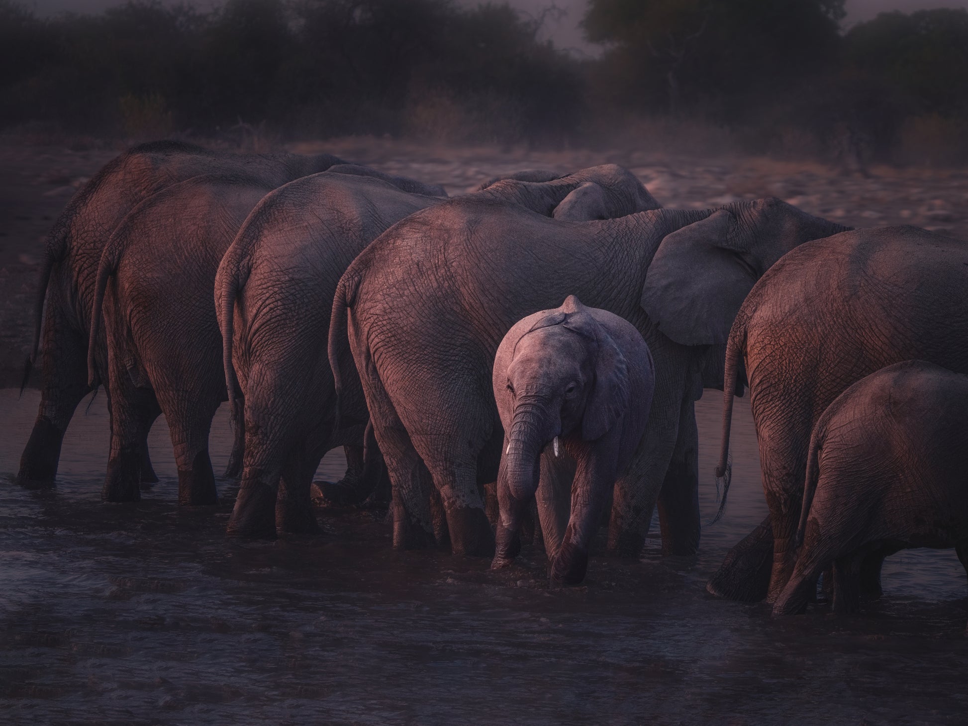 Alone Turning Around" är en väggtapet som tar dig med på en spektakulär safari i Namibia, Afrika. Den fantastiska bilden visar en flock elefanter som vandrar genom den vilda savannen. Du kommer att bli förtrollad av den imponerande naturen och det majestätiska djurlivet.