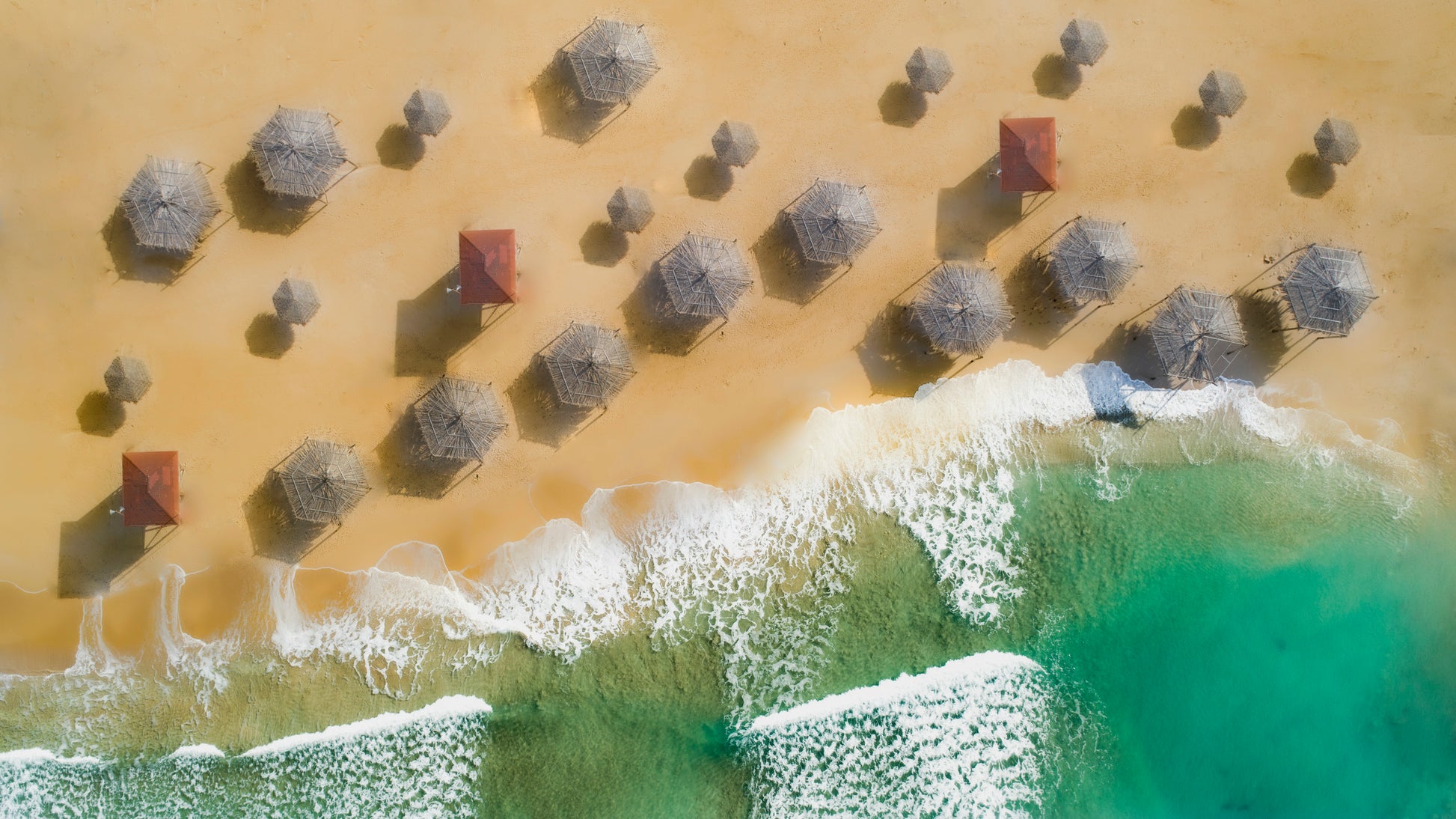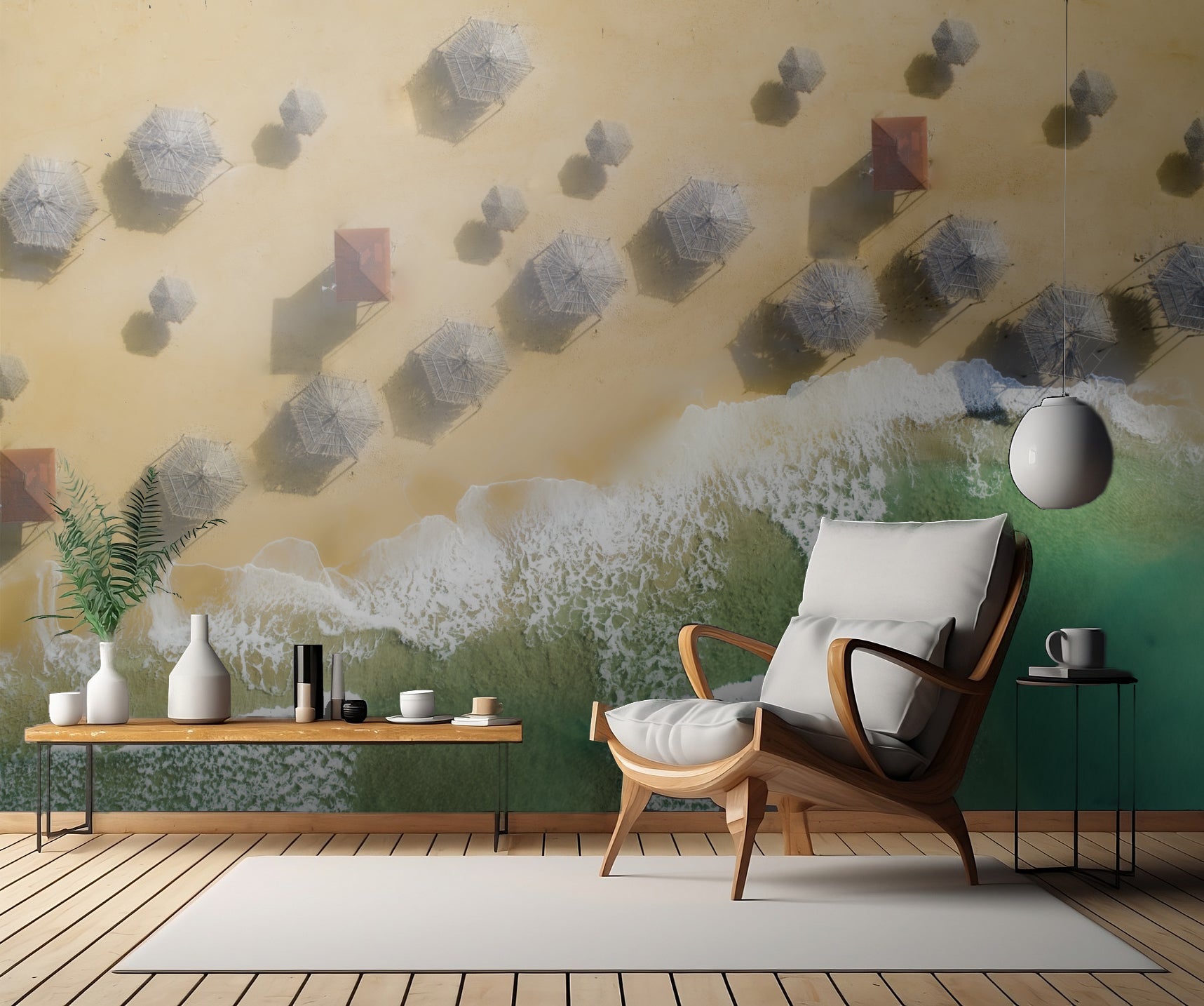 Tapeten fångar perfekt det magiska ögonblicket då du ser ut över stranden från ett högre perspektiv. Du känner den svalkande brisen och hör vågornas skvalp mot sanden. Med hjälp av fotograferingskonsten blir du nästan en del av bilden - det känns som om du svävar ovanför parasoll och hyddor längs stranden.