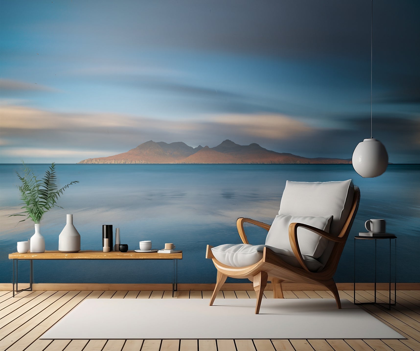 Vakna upp varje morgon till en episk soluppgång i Eigg med denna fantastiska väggtapet skapad av Luigi Ruoppolo. Den fångar öns magiska atmosfär med mjuka pastellfärger som smälter samman på himlen och reflekteras i det lugna havet nedanför.