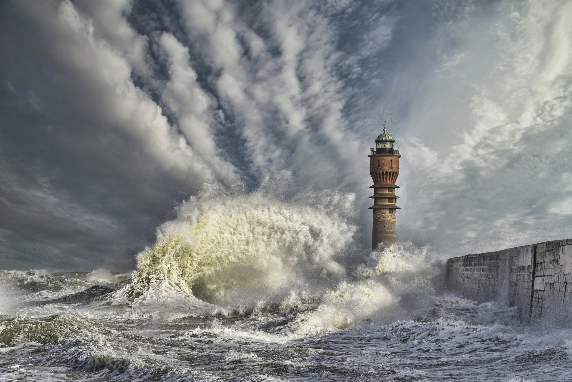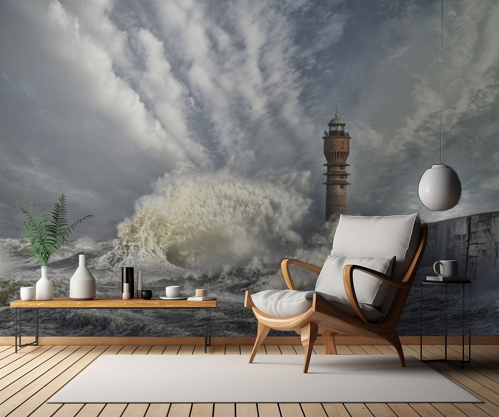 Tapetens motiv av ett majestätiskt fyr torn, omgivet av ett stormigt hav med höga vågor och mörka moln, skapar en känsla av spänning och äventyr. Den maritima känslan förstärks av landskapet som sträcker sig ända till horisonten, vilket ger en känsla av vidsträckt hav till din interiör.