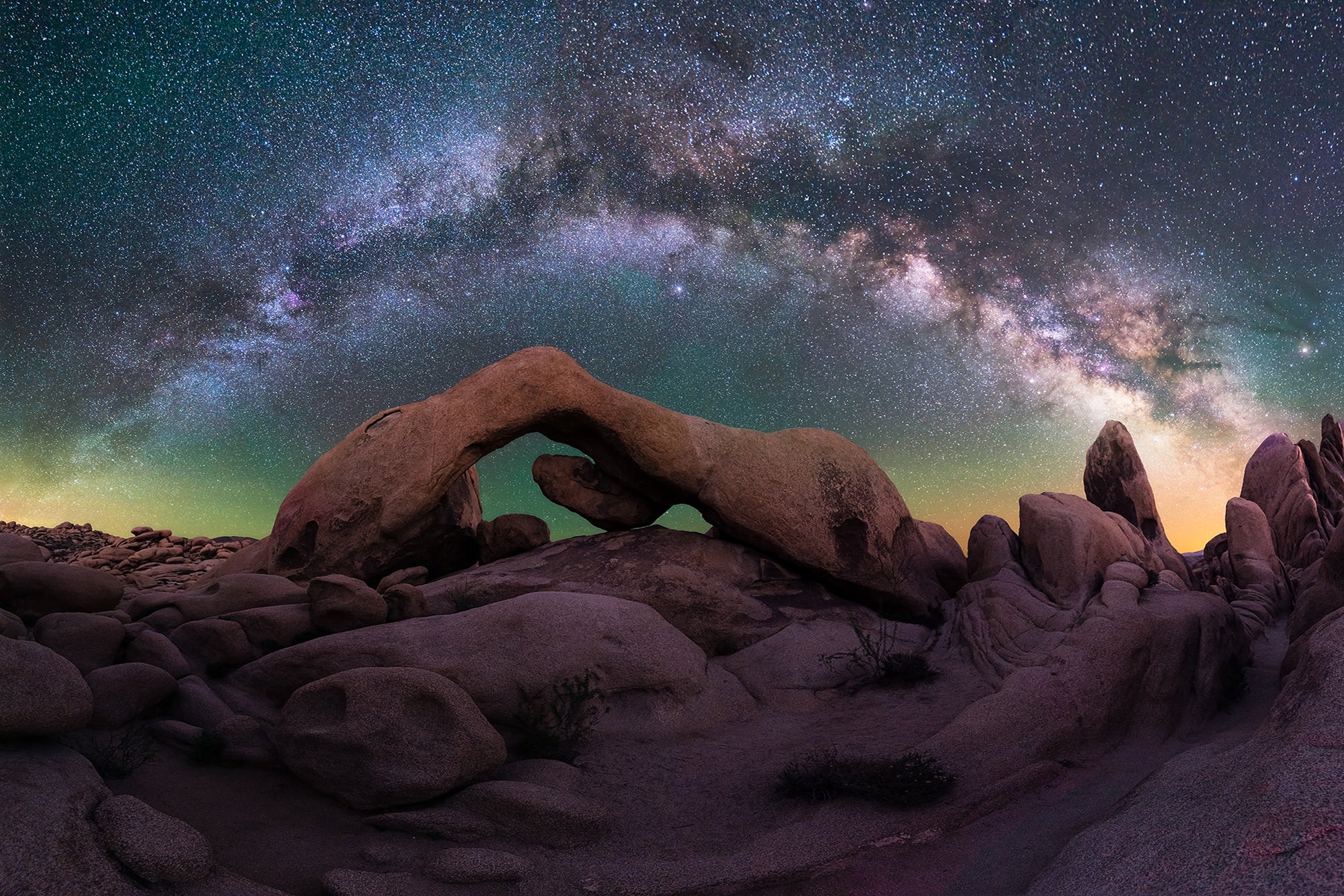 Ge ditt hem en fantastisk makeover med väggtapeten "Arch's Gallery"! Denna tapet tar dig med på en resa genom en magisk nattskap där imponerande bågar och bergsformationer möter en strålande stjärnhimmel. Inspirerad av världens vackraste naturliga panorama, inklusive den ikoniska Joshua Tree i USA, är detta konstverk en perfekt blandning av rymd och jord.