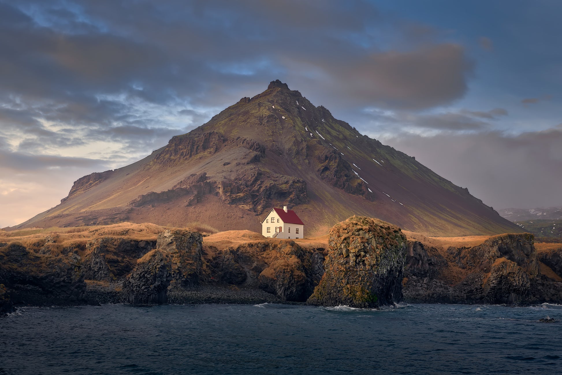 Bilden fångar en idyllisk stuga vid Arnarstapi, med de majestätiska isländska bergen som en dramatisk bakgrund.