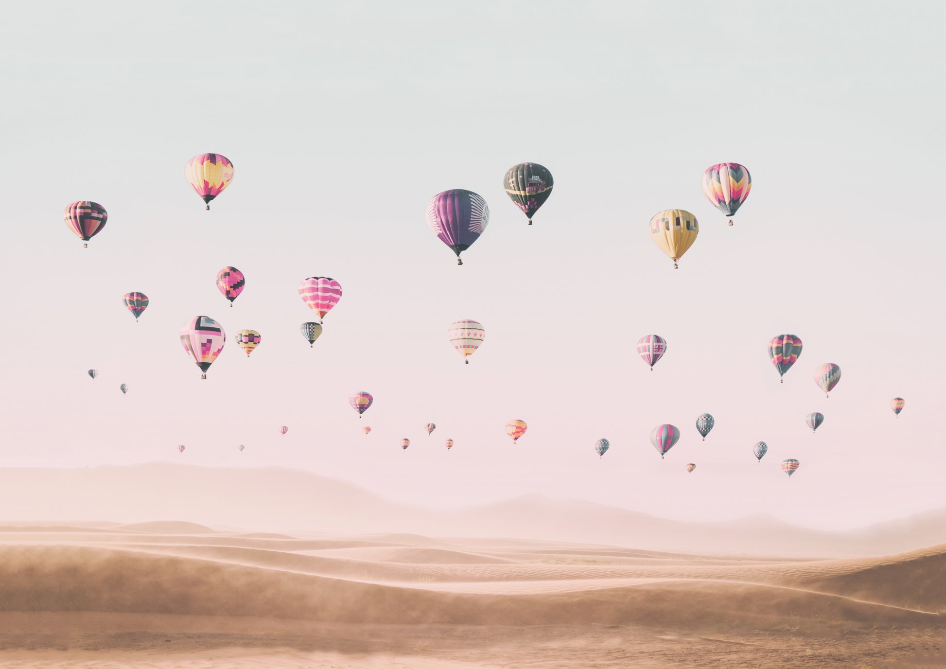 Denna uppiggande tapet tar dig med på en visuell resa genom fantastiska landskap runt om i världen, från ökenlandskap och sanddyner till luftballonger som svävar fritt mot en klarblå himmel.