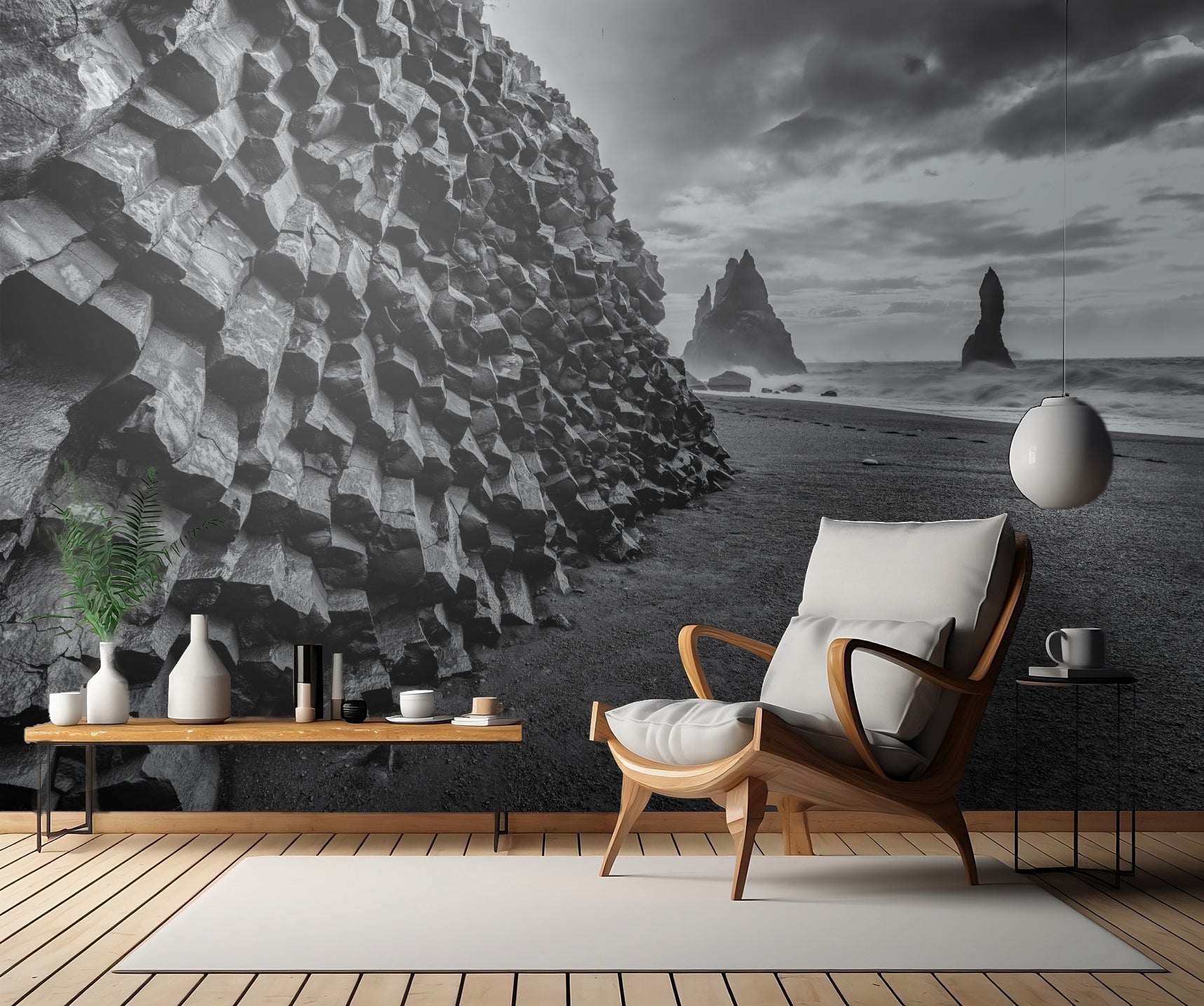 Tapetens design är inspirerad av kustlinjens otroliga skönhet och innehåller vackra element såsom havets vågor som bryter mot stranden och de imponerande klippformationerna längs kusten. För en touch av exotism har tapeten även influenser från svart sandstränderna på Island.