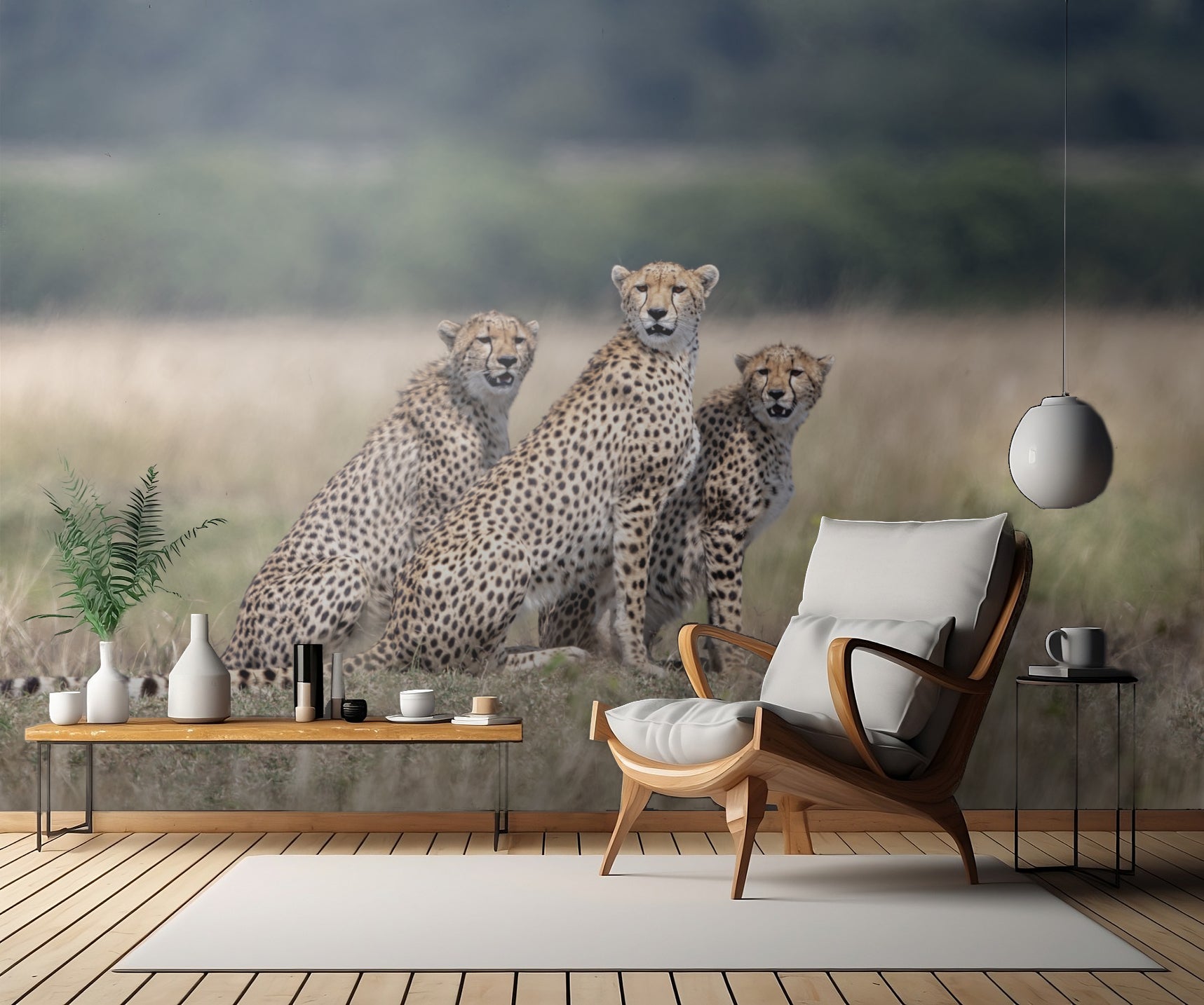 "Attention, please!"-tapeten har en perfekt balans mellan djur och natur. Den ger en sann känsla av att vara en del av vildmarken, och låter dig utforska den fantastiska skönheten hos de majestätiska geparderna. Varje detalj är noga utformad för att fånga din uppmärksamhet och skapa en atmosfär av djurliv och frihet.