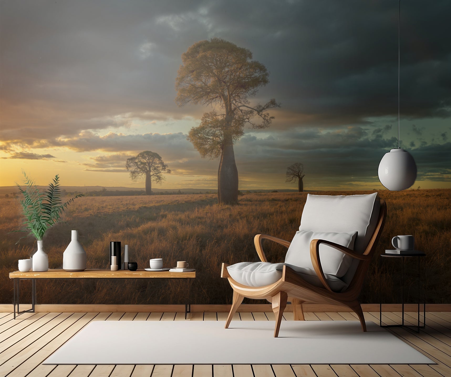Ett perfekt val för dig som älskar naturen och vackra landskap. Tapeten ger rummet en dimension av vidsträckta fält och landskap i det vackra Queensland. Den mjuka färgskalan och det harmoniska motivet skapar en lugn och fridfull atmosfär. Varje gång du tittar på "Australian Baobad" kommer du att drömmas bort till de vackra australiensiska landskapen.