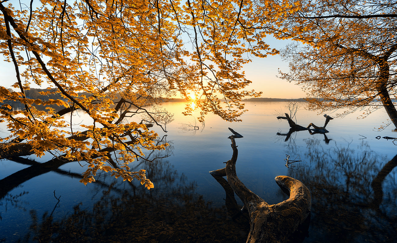 Denna tapet skildrar en sensommarmorgon då solen börjar kika fram över vattnet, skapandes en lugn och fridfull atmosfär. Genom att placera denna tapet på din vägg kan du skapa en rogivande miljö som påminner dig om lugnet i naturen. Perfekt för dig som vill ta med naturens skönhet in i ditt hem.