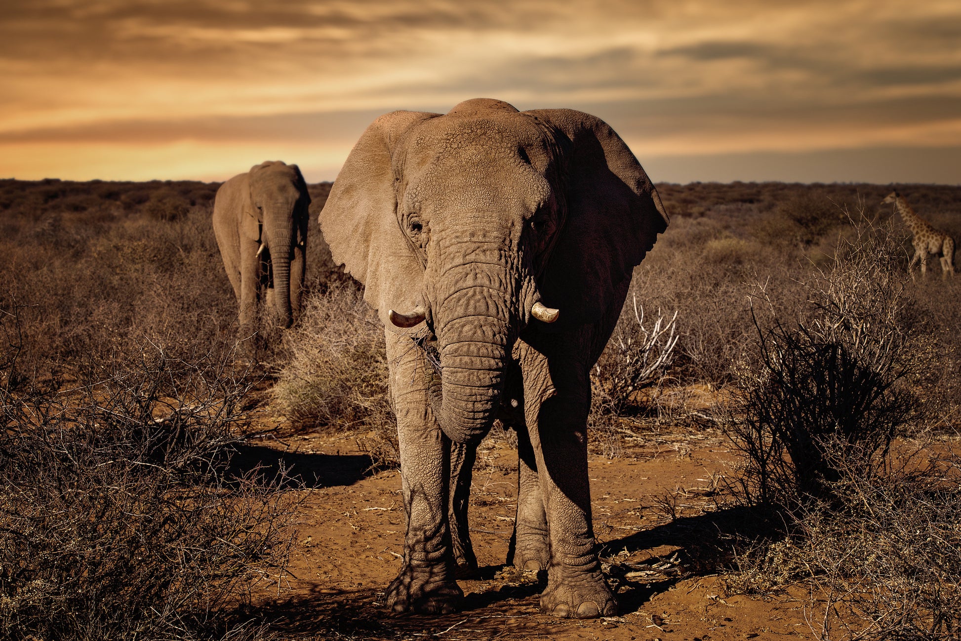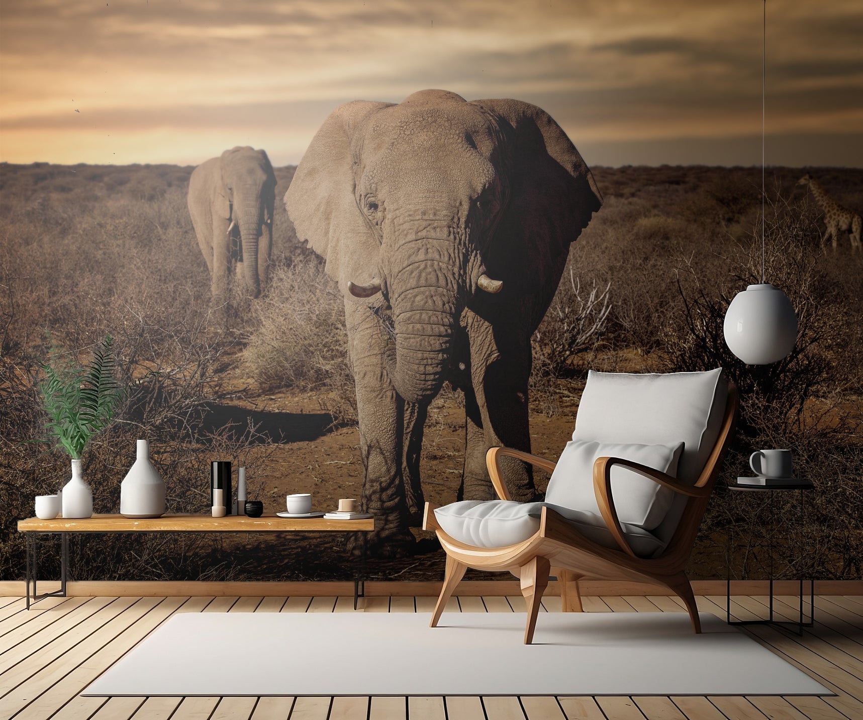 Den imponerande elefanten som syns på tapeten förmedlar en känsla av storhet och styrka, samtidigt som den vilda och fria känslan av Afrikas landskap förstärks av detaljer som sanddyner och öknens bruna toner.