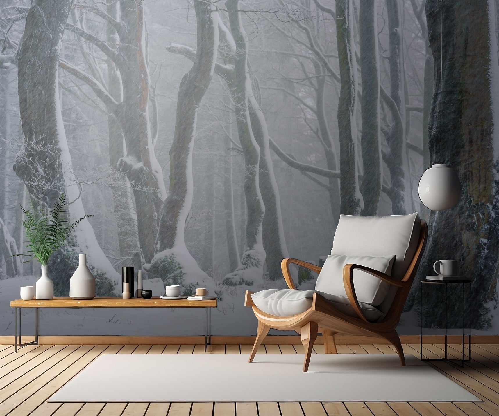 I denna tapet fångar Wies det magiska med vinterns väderförhållanden. Då den snöar kan du nästan känna den friska luften och höra vinden som susar genom träden. Det är som att stå mitt i en snöstorm eller en vit skogsdimma. Du kan nästan föreställa dig den frostiga kylan som nuddar ditt ansikte när du betraktar denna konstverk på din vägg.