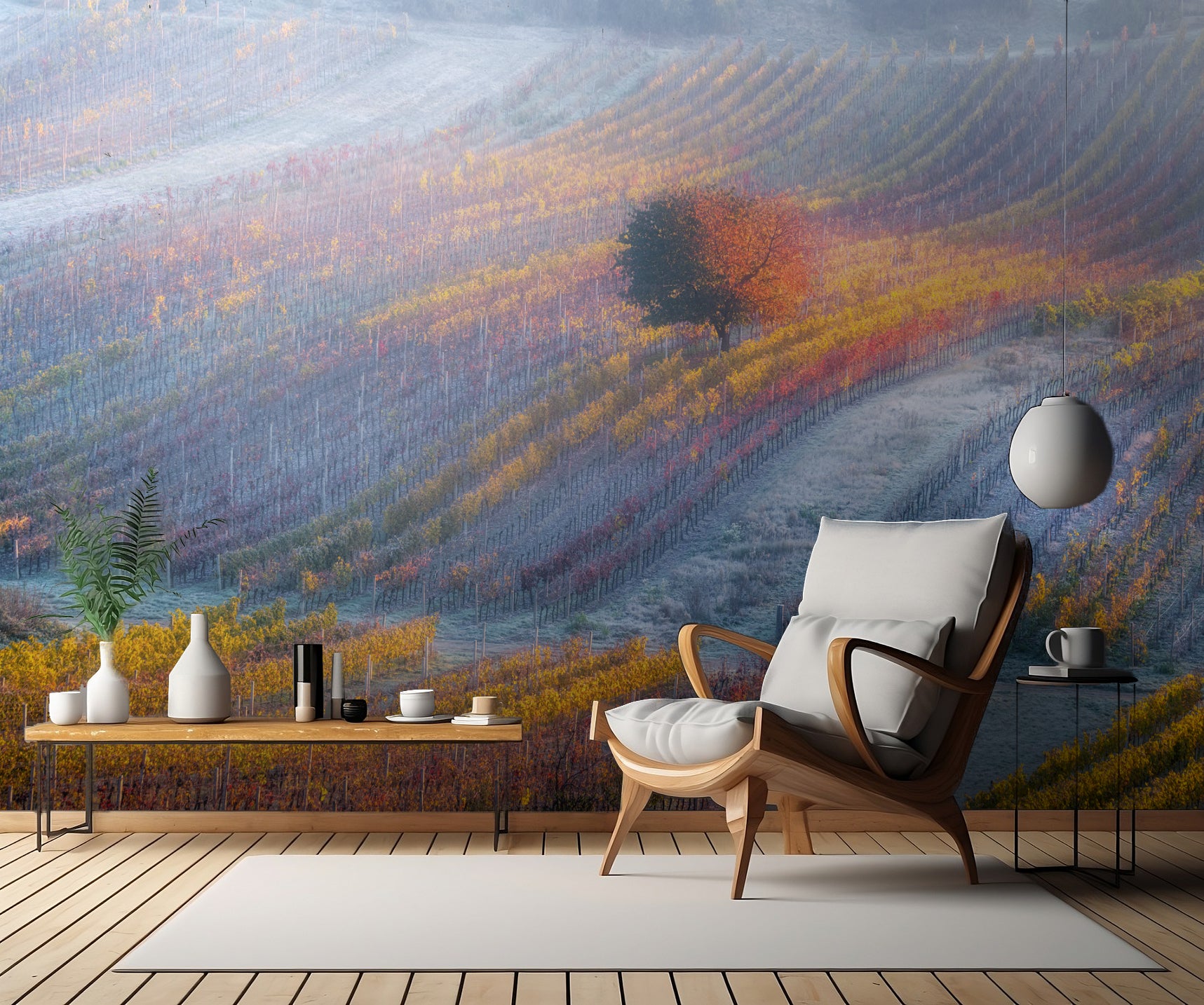 Det faktum att tapeten är inspirerad av hösten ger en varm och mysig känsla, medan det omgivande landskapet av lantbruk och vinodlingar ger en förnimmelse av den lugna landsbygden. Breath of winter... är vackert utformad för att förbättra atmosfären i varje rum och ta med naturens lugn och ro till ditt hem.