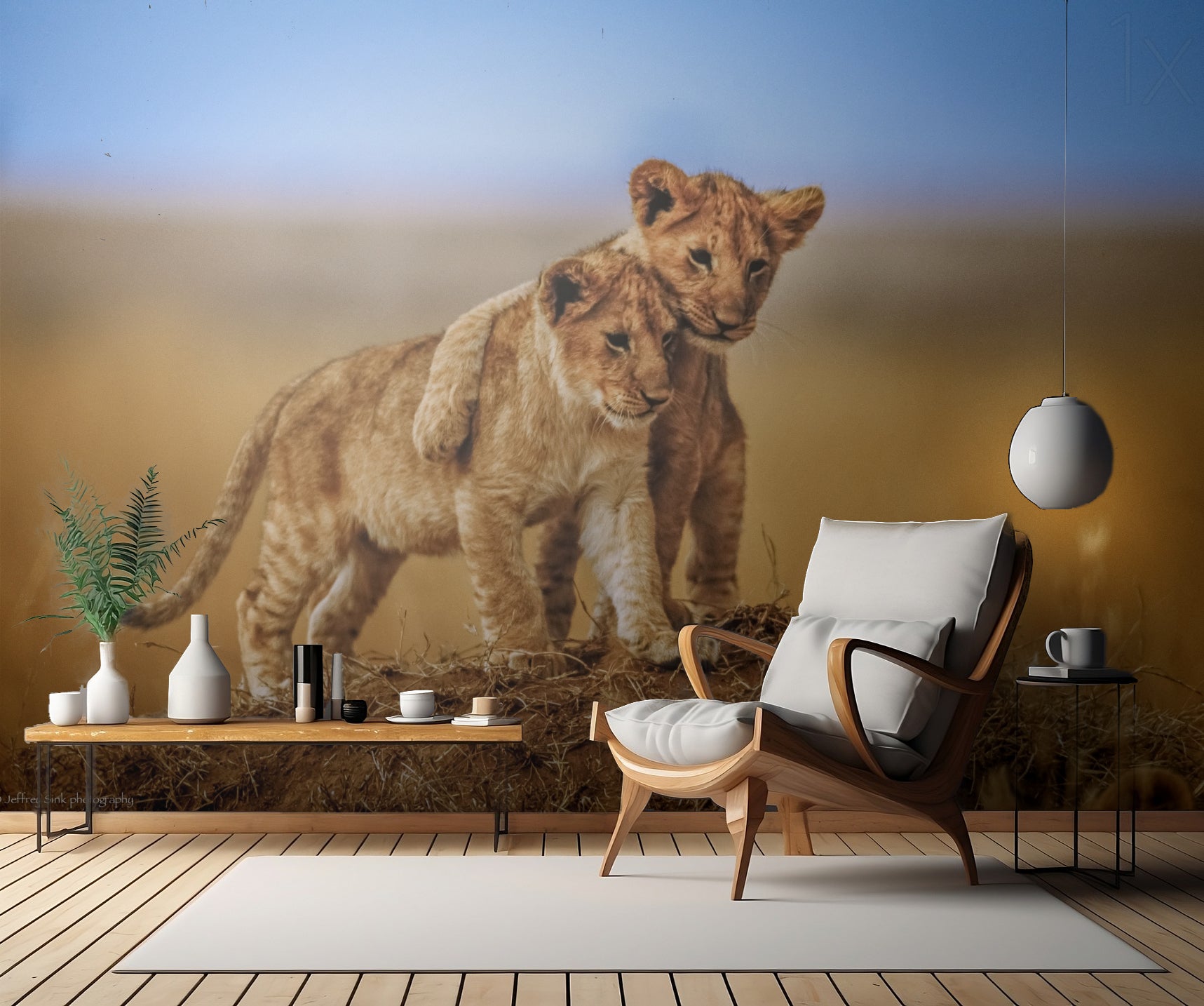 Upplev den förtrollande skönheten i naturen i ditt eget hem med väggtapeten "Brothers for Life". Denna otroliga tapet är inspirerad av djungelns mystik och de magnifika djuren som bor där. Med ett motiv av lejonungar och sinnet för broderskap fångar "Brothers for Life" en känsla av kärlek och vänskap som är både vacker och enastående.