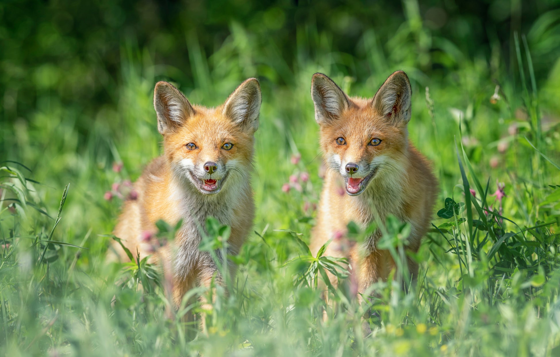 Denna tapet är inte bara bedårande, utan den ger även en dynamisk touch till ditt hem tack vare det subtila användandet av bokeh-effekten. Bröderna ramar in din värld med ökad djupuppfattning och ger en förtjusande kontrast till den gröna gräsmattan.