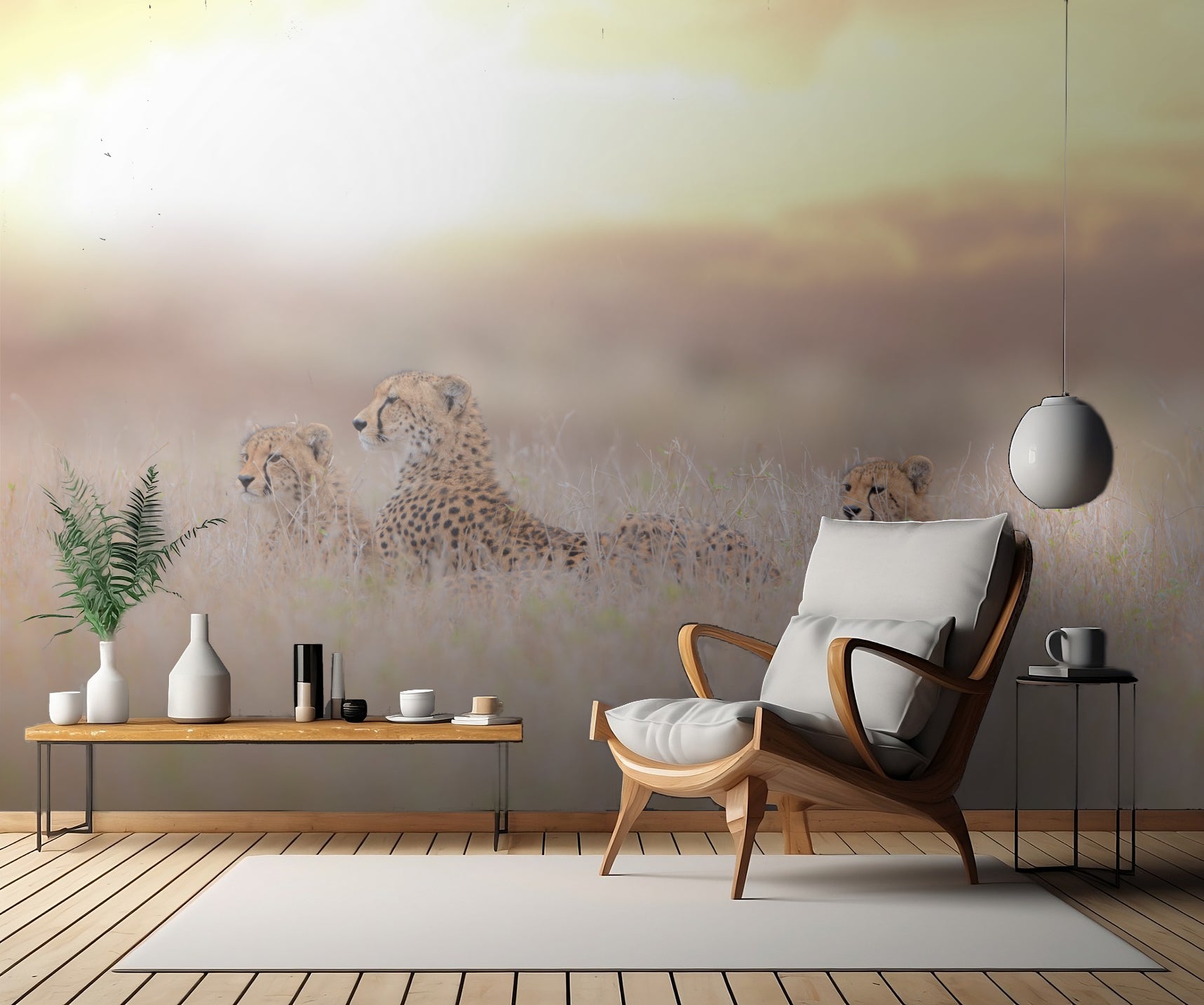 Dyk in i den vilda världen med vår väggtapet "Cheetah Family"! Med en närbild av en lejonfamilj, bestående av en imponerande mamma och hennes lekfulla ungar, ger denna tapet en känsla av fart och elegans till ditt rum.