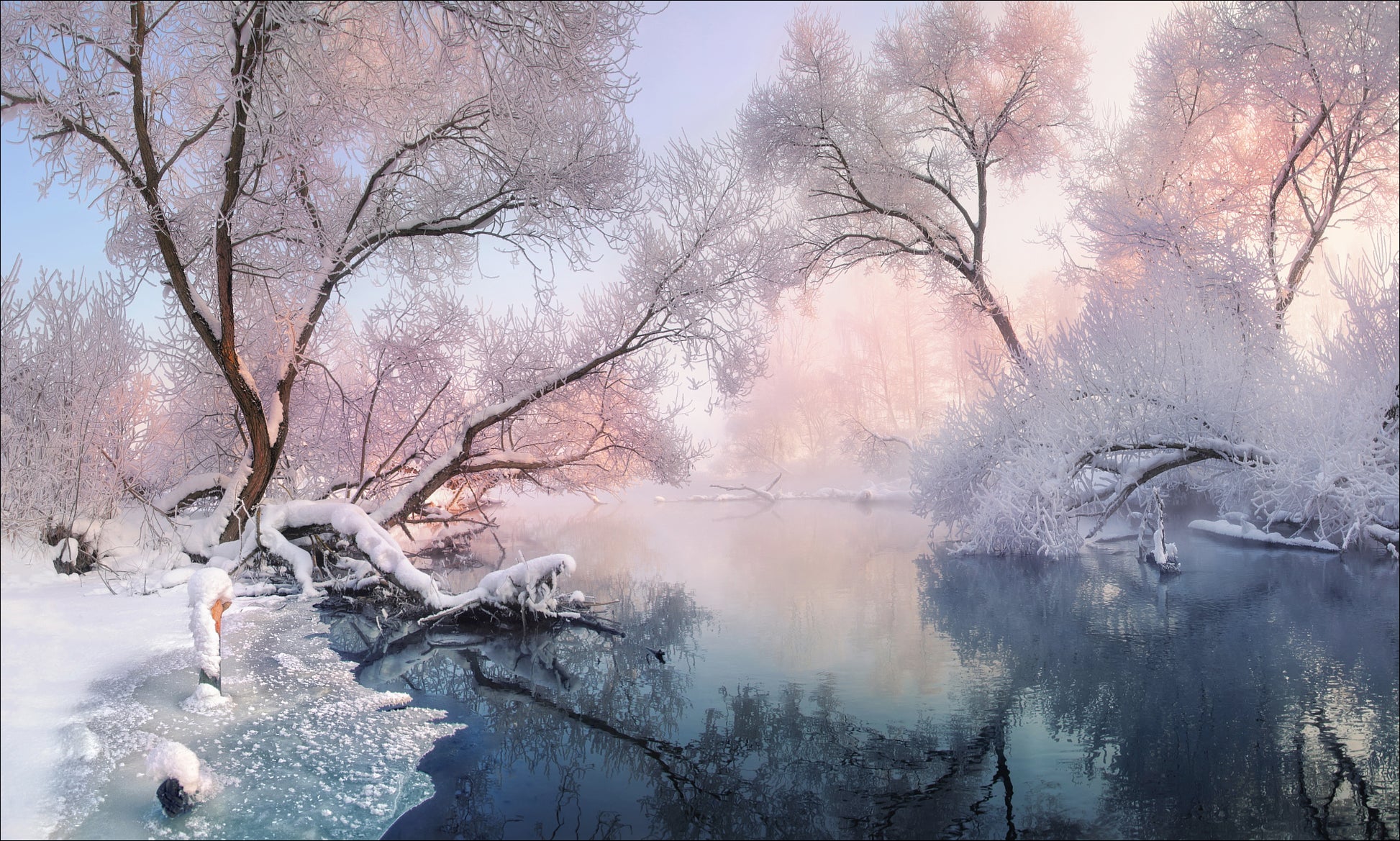 Den rosa tonen ger en touch av romantik till det annars kalla och frostiga landskapet. Genom speglingar i vattnet och de snötäckta träden skapas en atmosfär av stillhet och harmoni. Denna tapet är perfekt för att skapa en mysig stämning i ditt hem under jul- och vintertid.