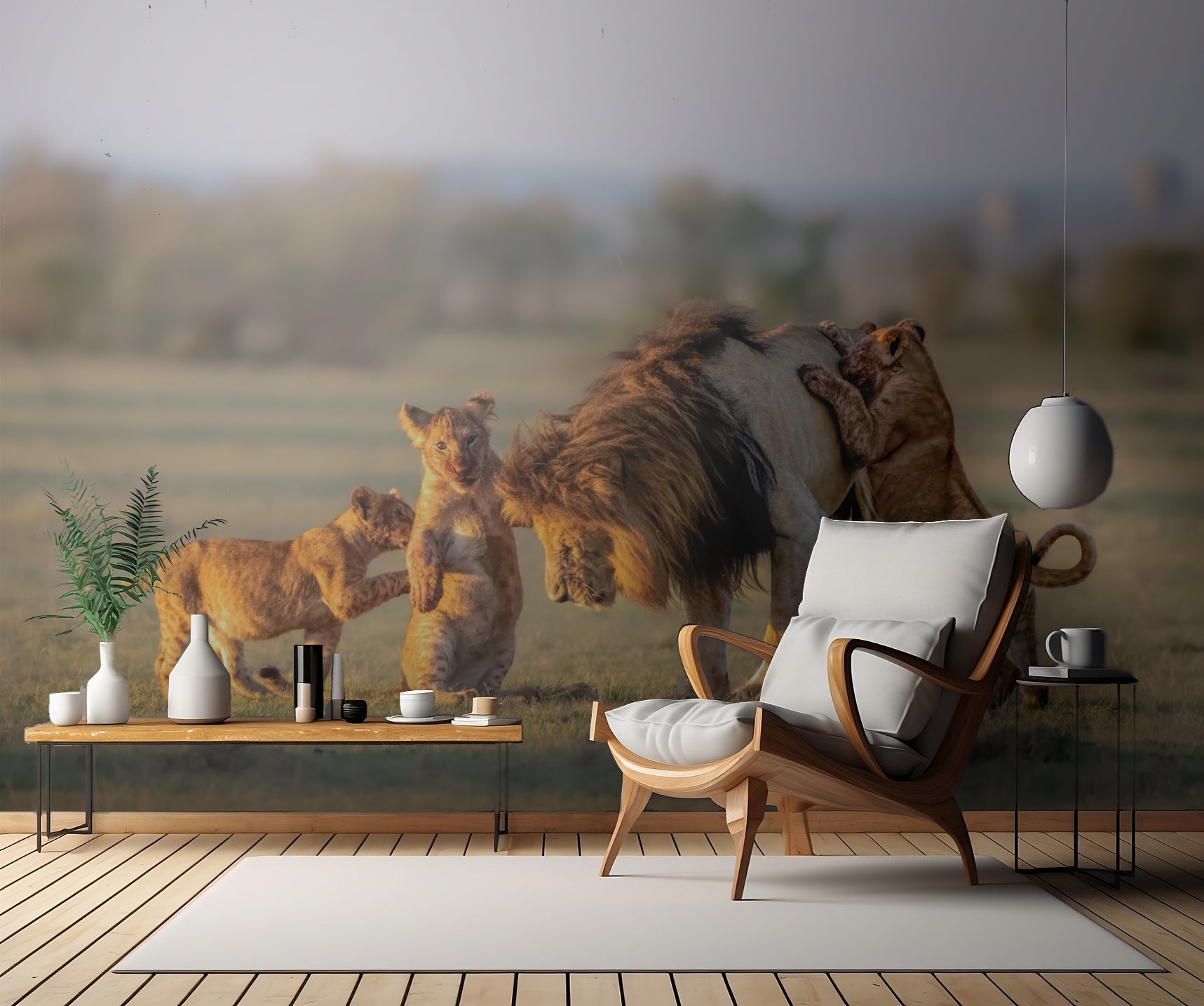 Ge ditt rum en exotisk touch med väggtapeten "Dad and Kids" skapad av MIN LI. Denna tapet fångar ögonblicket när en stolt lejonhane leker med sina ungar på den afrikanska savannen. Den vilda naturen och de bedårande djuren skapar en unik och levande atmosfär i ditt rum. Med detta motiv får du en känsla av safari äventyr och förtjusande stunder mellan lejonfamiljen. Ge ditt rum ett lekfullt och charmigt inslag med denna tapet och låt din inredning berätta en historia om vilda djur och den vackra naturen i Afrika.uppenbjudande formatet i förhållandet 1:4 ger en stilfull och elegant look som passar perfekt för att ge rummet en unik touch. Bring the wild into your home with "Dad and Kids" tapeten.