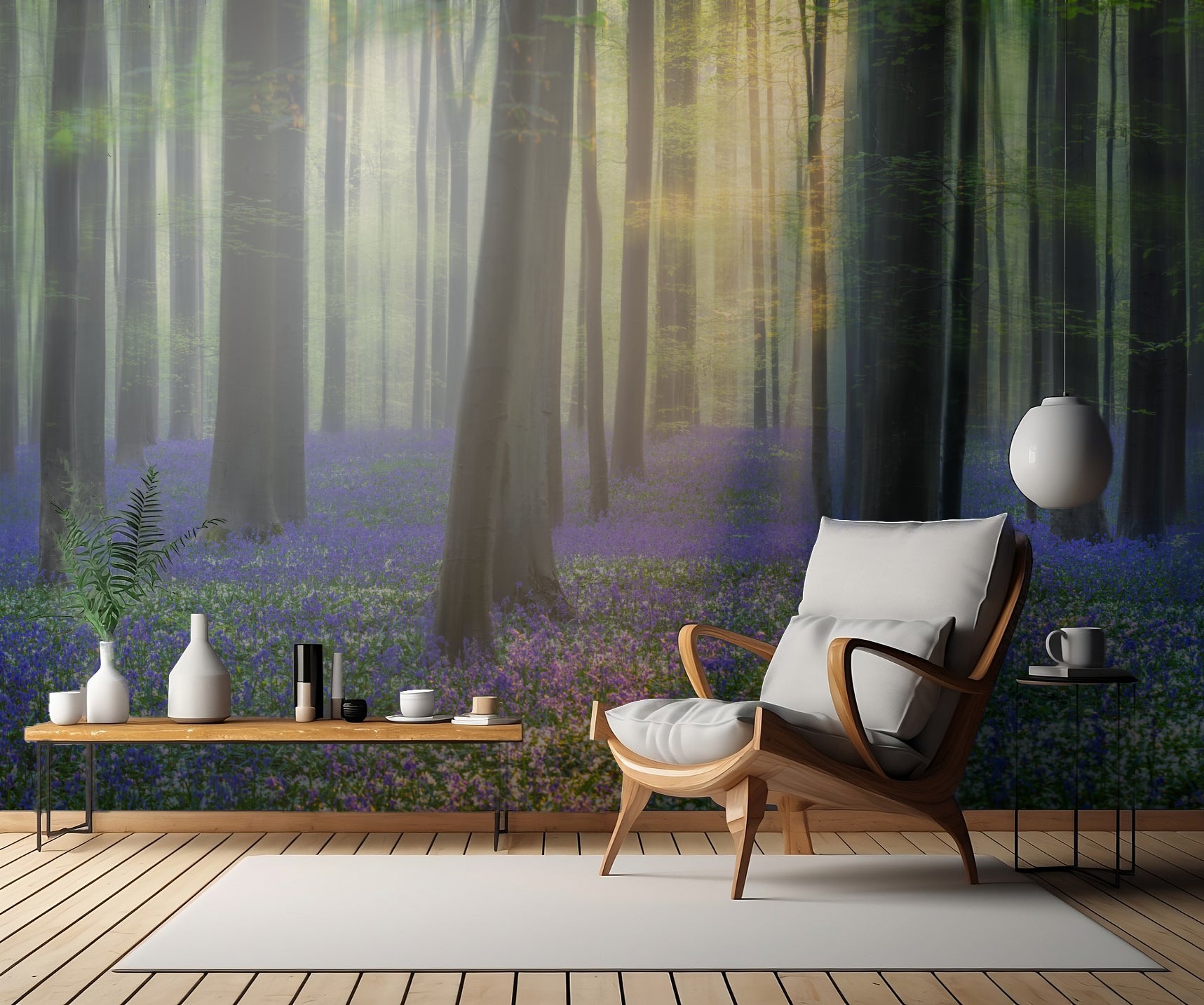 Med detaljerade trädstammar och blommor i blå och lila toner skapar denna tapet en harmonisk och naturlig atmosfär. Låt dig drömma dig bort till de vilda skogarna i Hallerbos, Belgien och förlora dig själv i naturens skönhet.