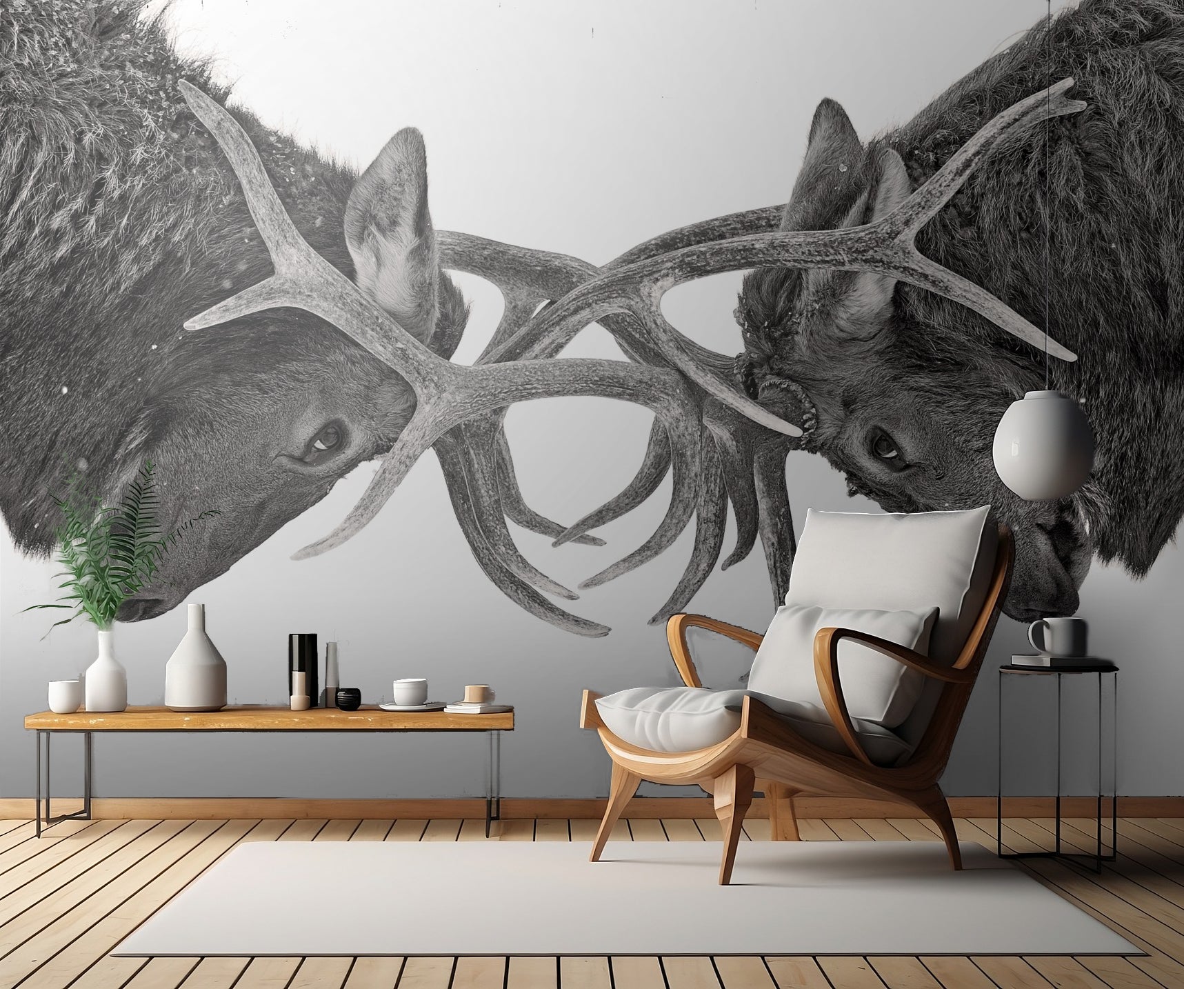 Med motivet av dessa två älgar i kamp förmedlar tapeten både kraft och skönhet från naturens vildmark. Låt din vägg bli en konstnärlig skildring av detta mäktiga ögonblick och låt dig sugas in i den dramatiska berättelsen om kampen om överlevnad.