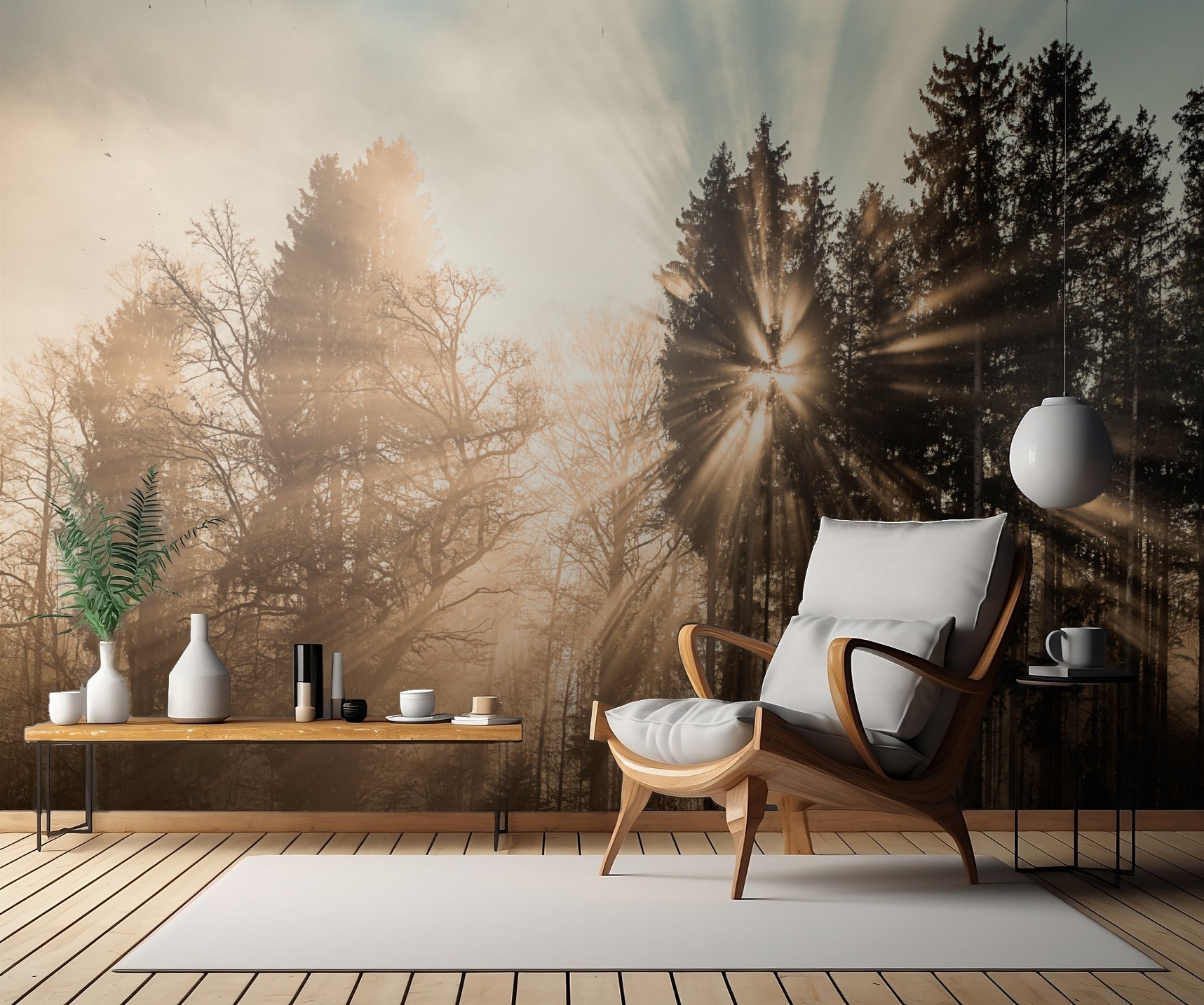Med detaljrika bilder av träd, solstrålar och ett dimmigt landskap ger denna tapet en känsla av perspektiv och djup. De mjuka tonerna och de subtila skuggorna skapar en harmonisk och lugnande atmosfär som passar perfekt i både vardagsrummet och sovrummet.