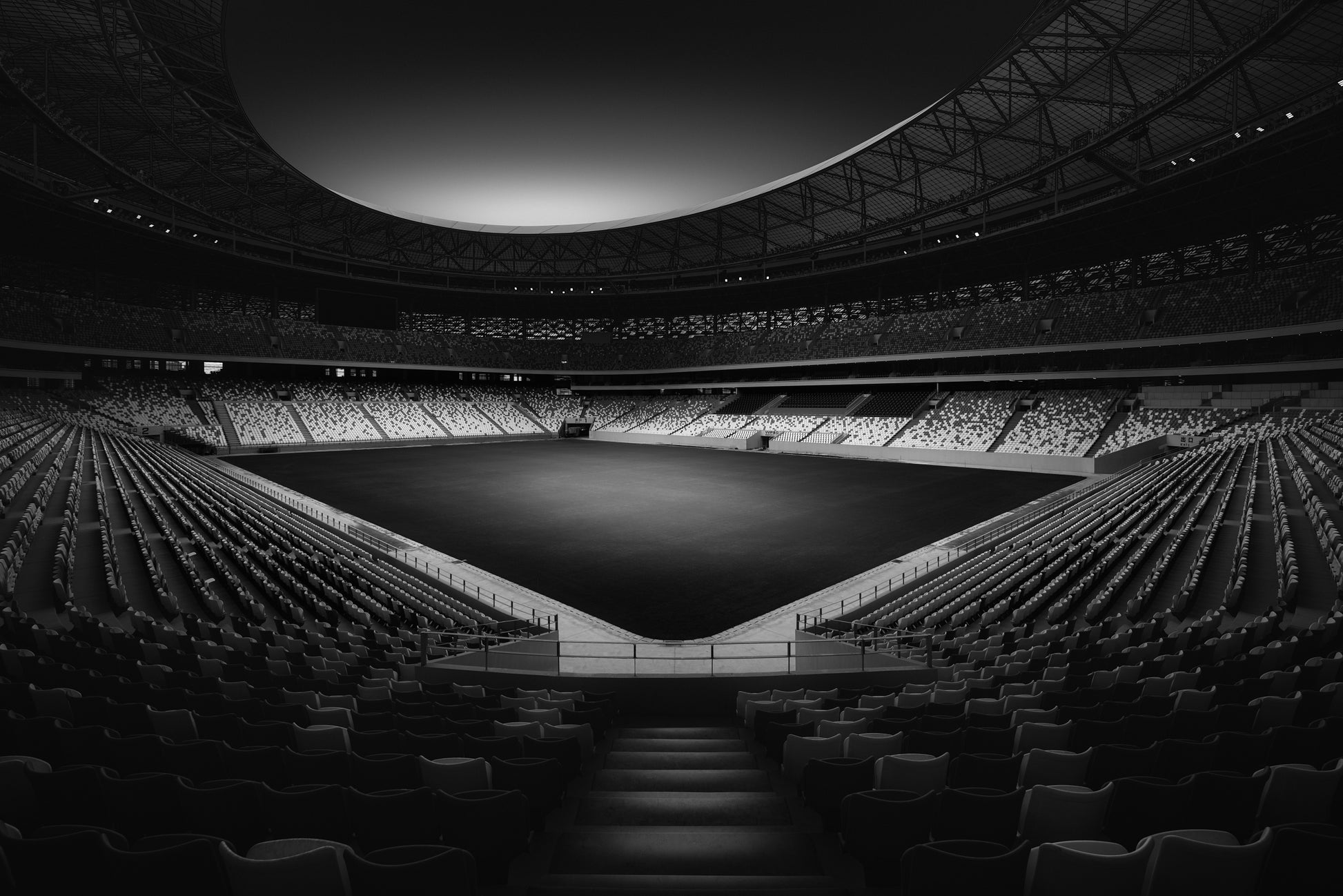 Låt Alvin Wangs mästerverk "Fight" förvandla ditt rum till en spännande stadsscen med denna imponerande väggtapet. Med en sammansättning av stadsbyggnader, former och en mörk, svartvit ton skapar denna tapet en atmosfär av urban elegans. Med perspektiven och låg-nyckelbelysningen tar tapeten dig till en tom arena eller stadion, där du kan känna spänningen av sportevenemang utan att lämna ditt eget hem.